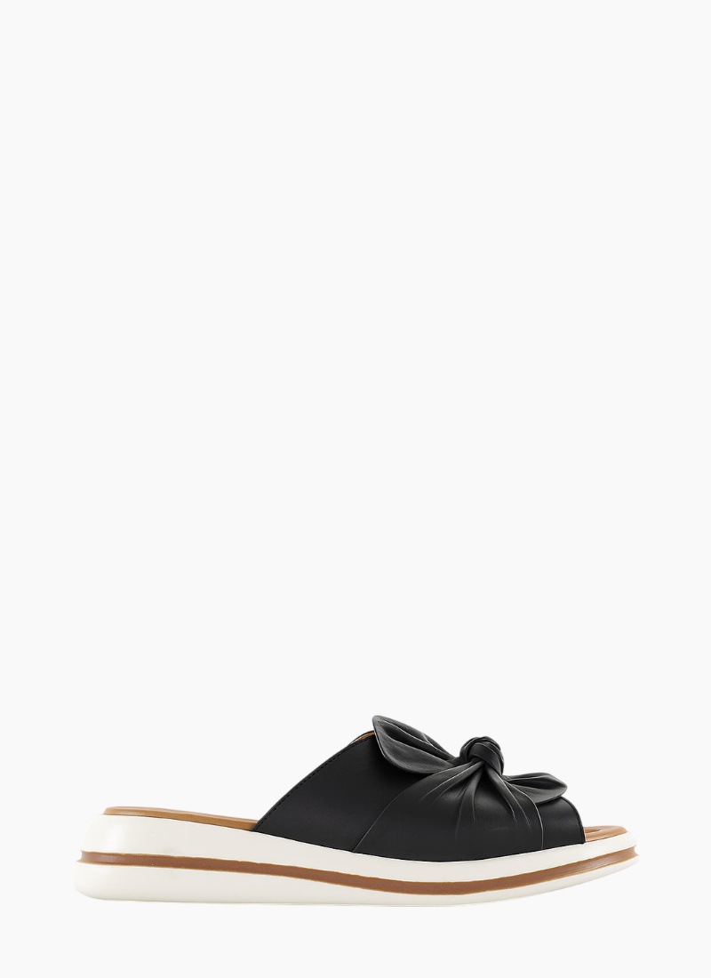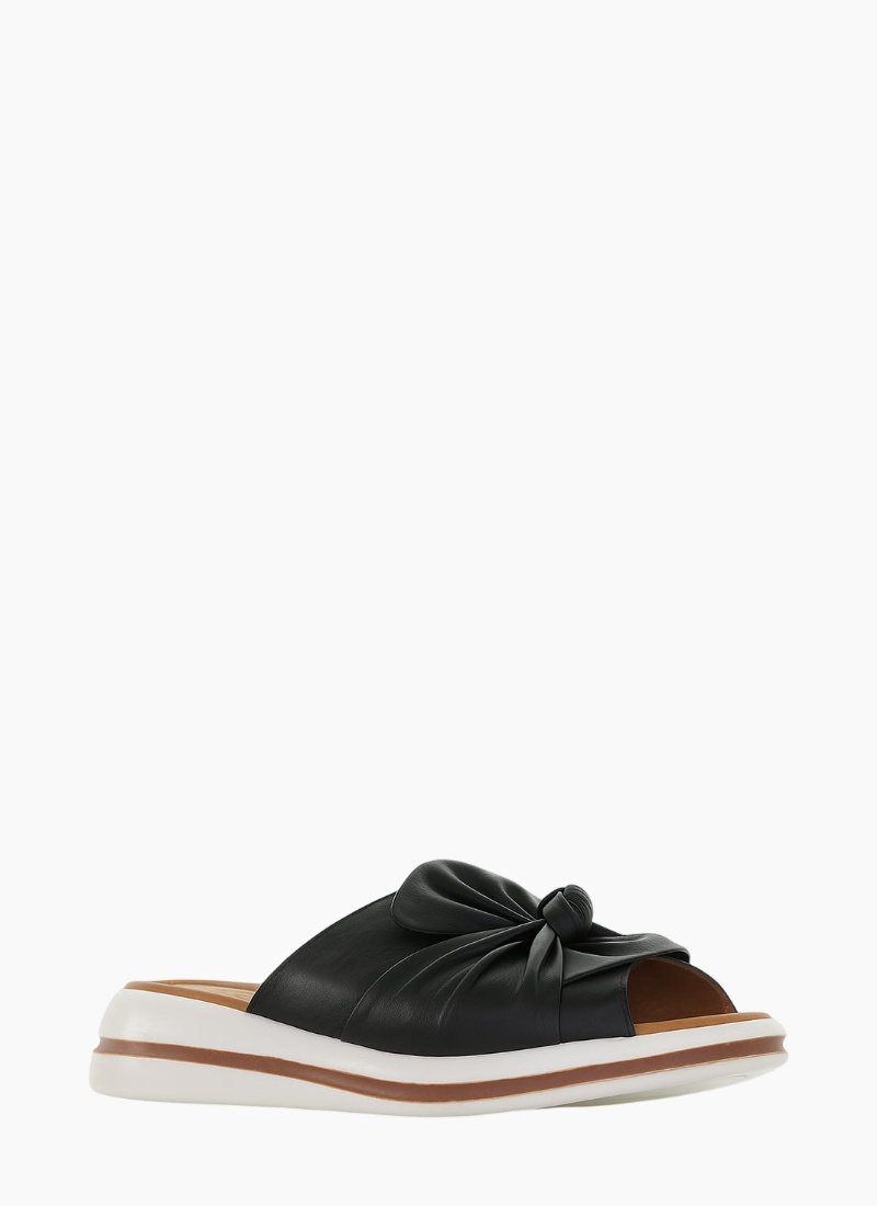 - Crafted from soft black leather with a twisted knot detail across the toe, offering a chic focal point