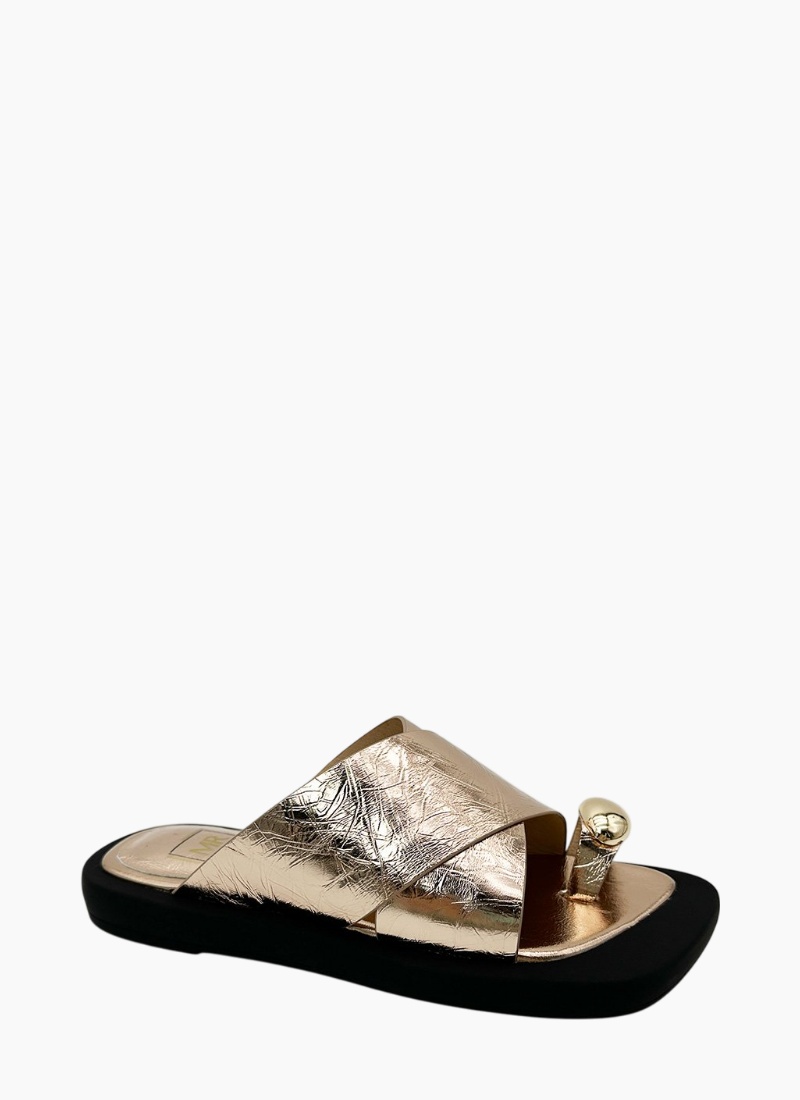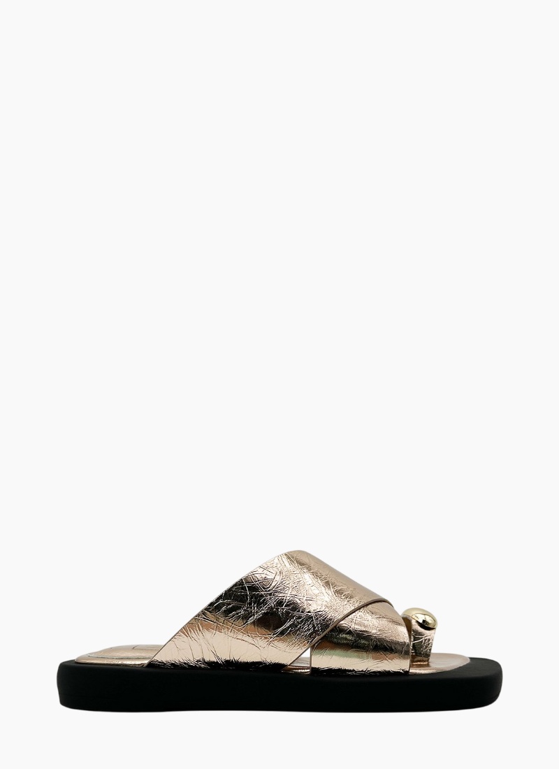 Introducing the Agree Gold Crushed leather sandle from Mila Raine. This luxe, contemporary sandal blends metallic crushed leather with sculptural hardware for a modern everyday statement.