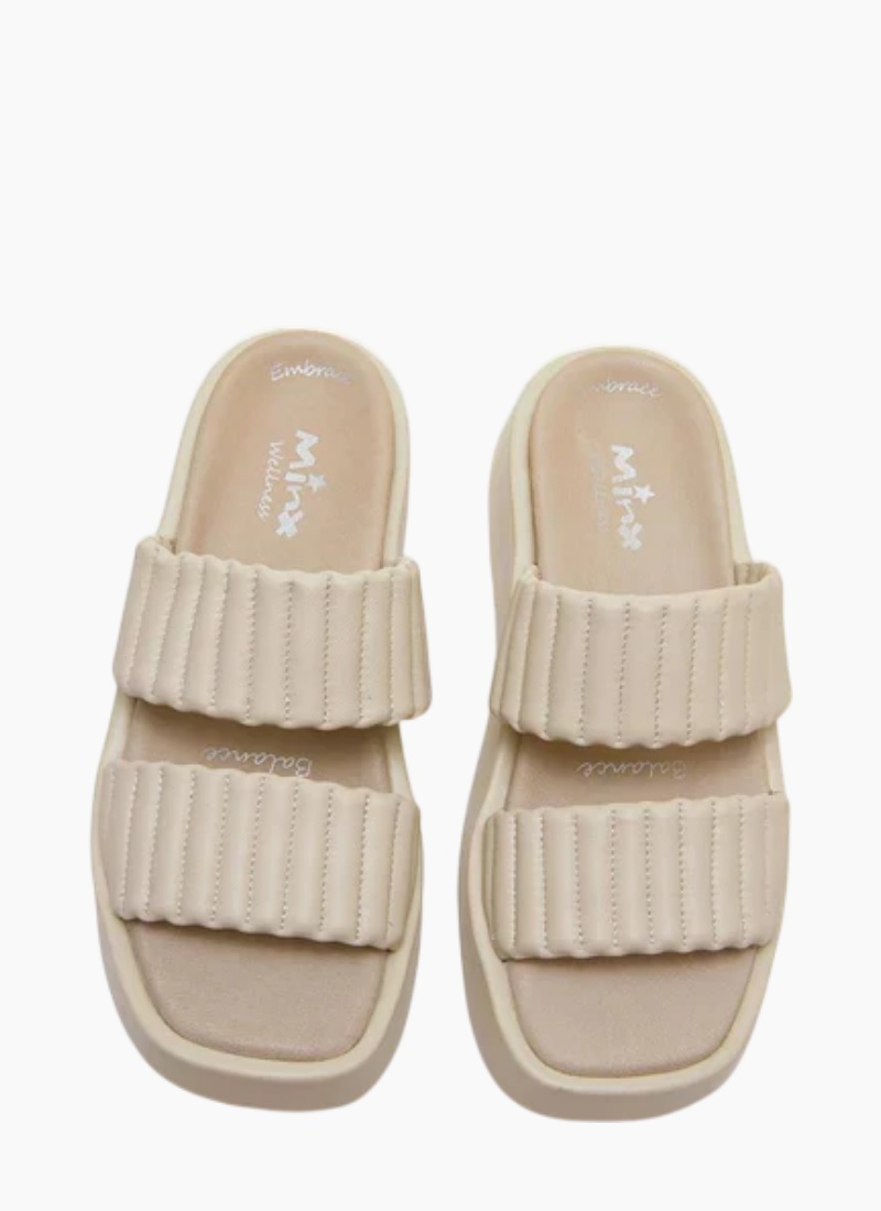 Breeze through summer with the ultimate slide sandal. This chic wedge slip-on features double rouched leather straps and is designed for ultimate underfoot comfort, thanks to our Wellness footbed that supports your heels, arches, and toes. Breeze is your go-to for effortless summer dressing, whether paired with a floaty sundress, a flowing maxi, or your favorite denim shorts—making it the perfect one-stop summer slide for all-day wear.