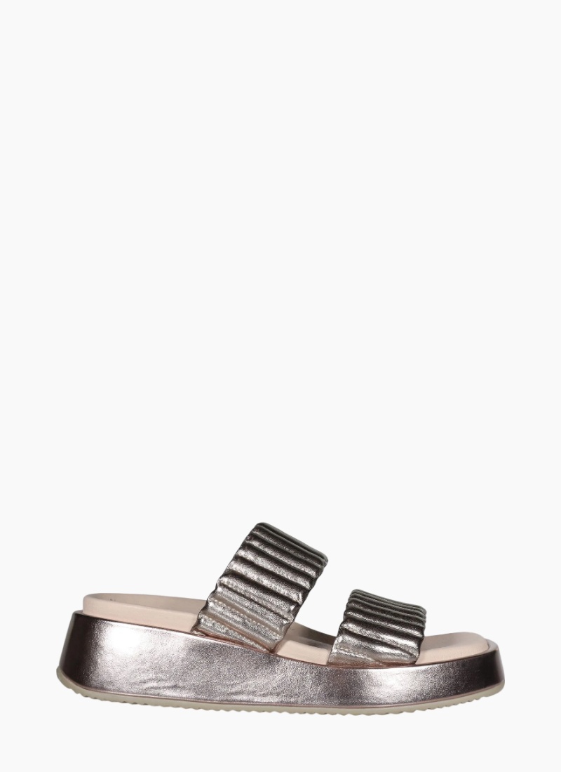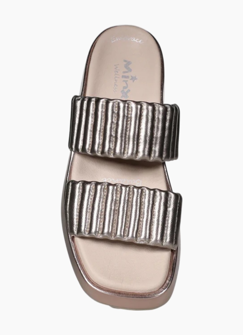 Introducing the Breeze SANDAL from Minx. This luxe metallic slide blends sculptural straps with cushioned comfort for everyday glamour.