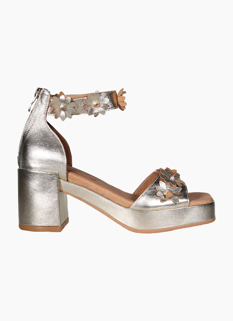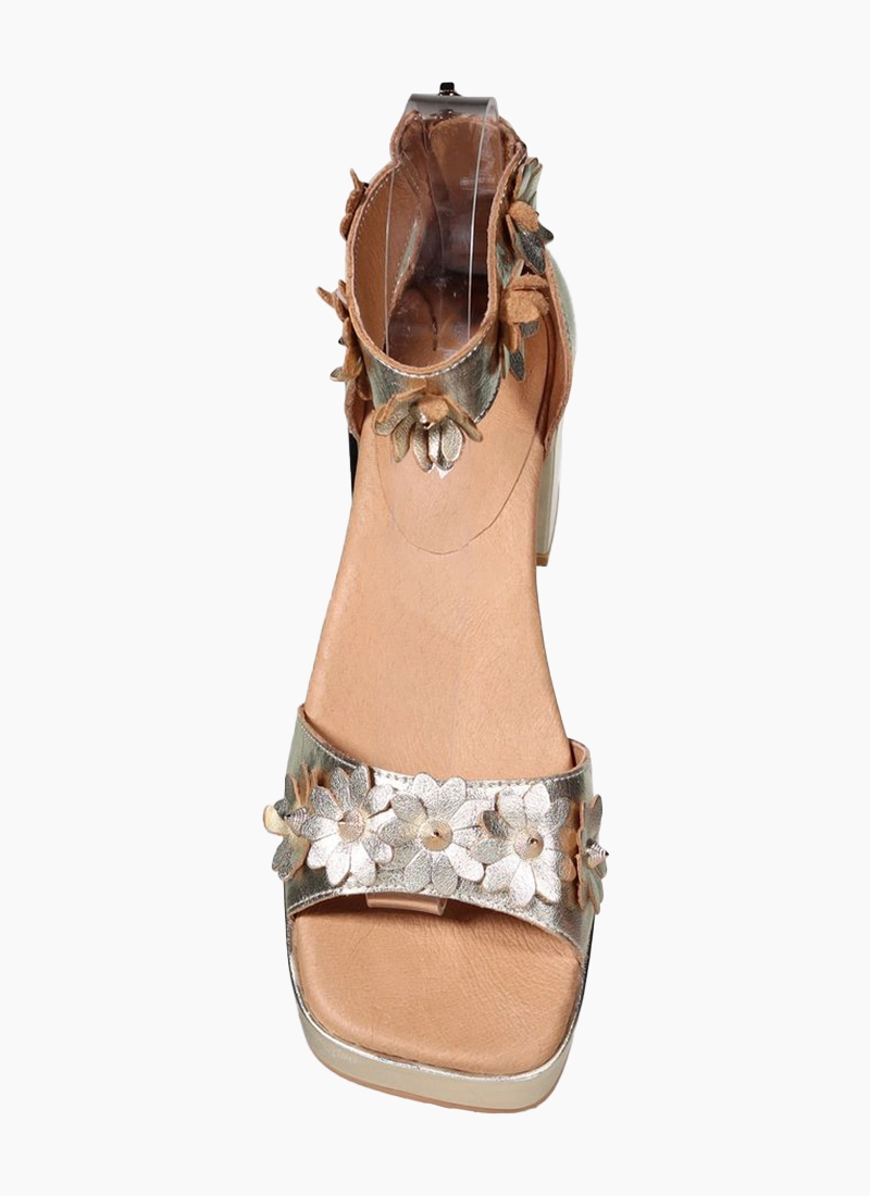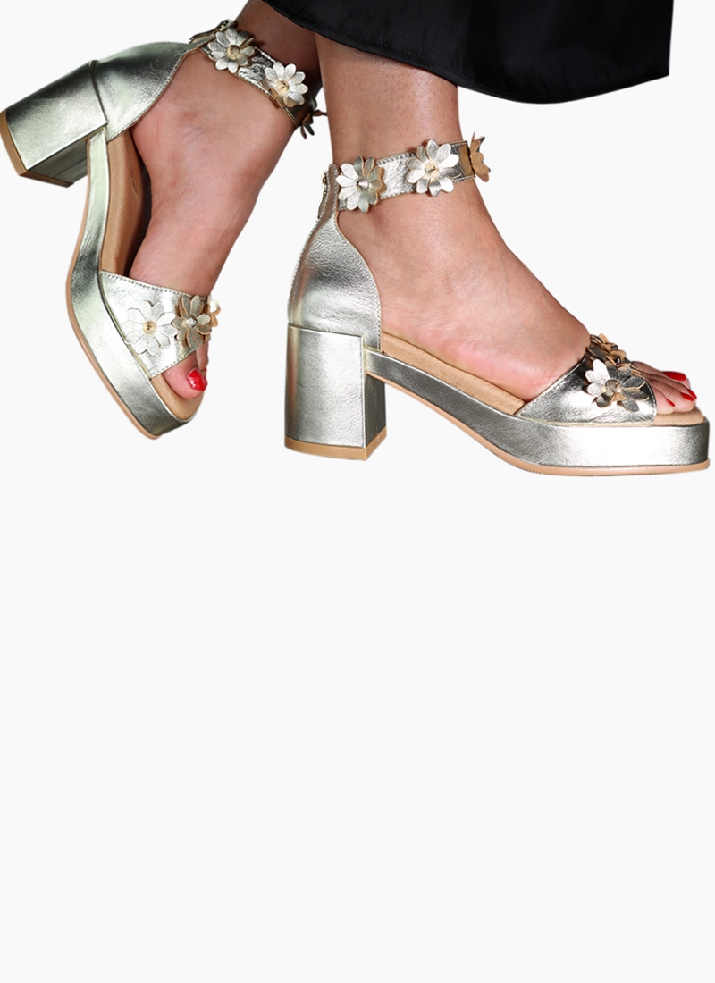 Step into summer with Gala Floral, the ultimate statement heels. These leather platforms feature a wide toe strap and a supportive ankle strap, both adorned with stunning daisy-like embellishments. The stacked, matching leather-wrapped heel provides stability, while the heel zip ensures ease of wear. Gala Floral will have you feeling like royalty at the spring gala and looking fabulous at any occasion.