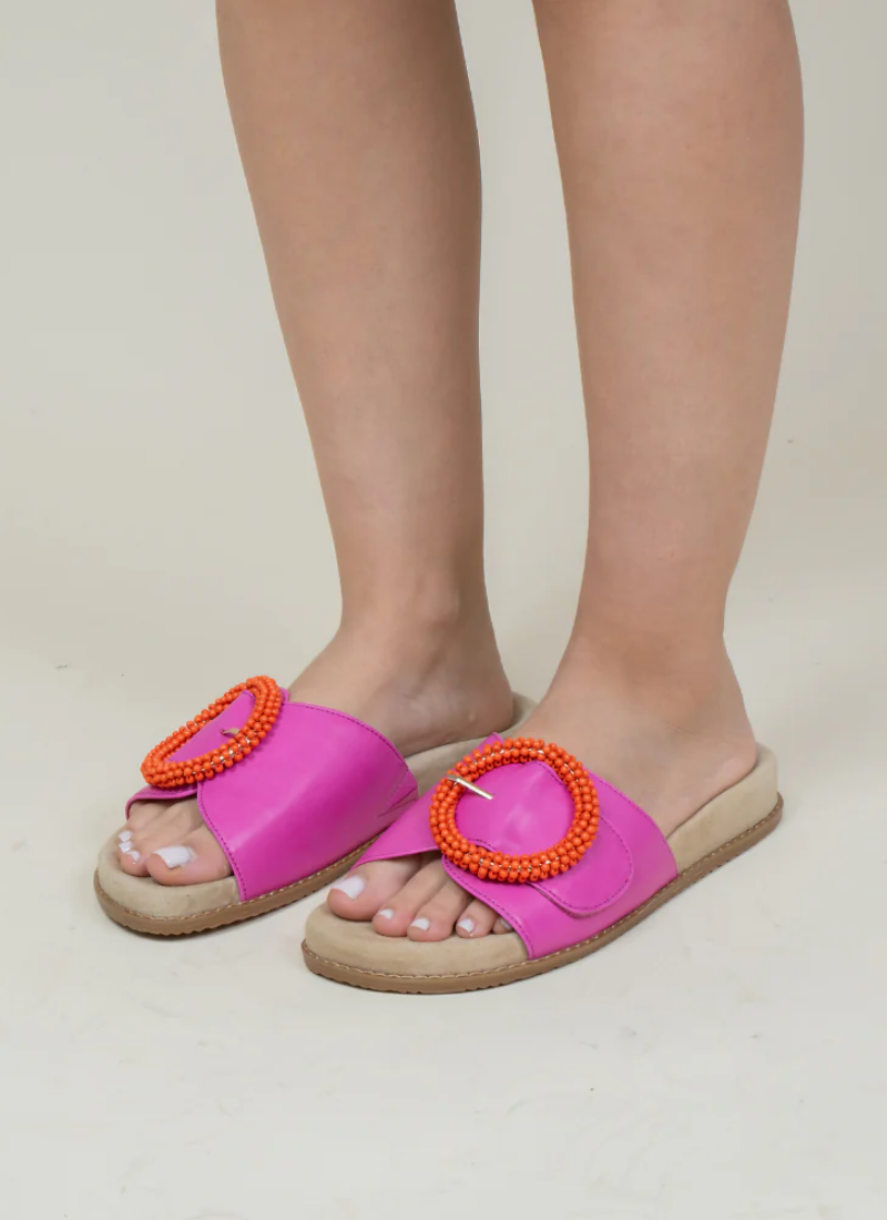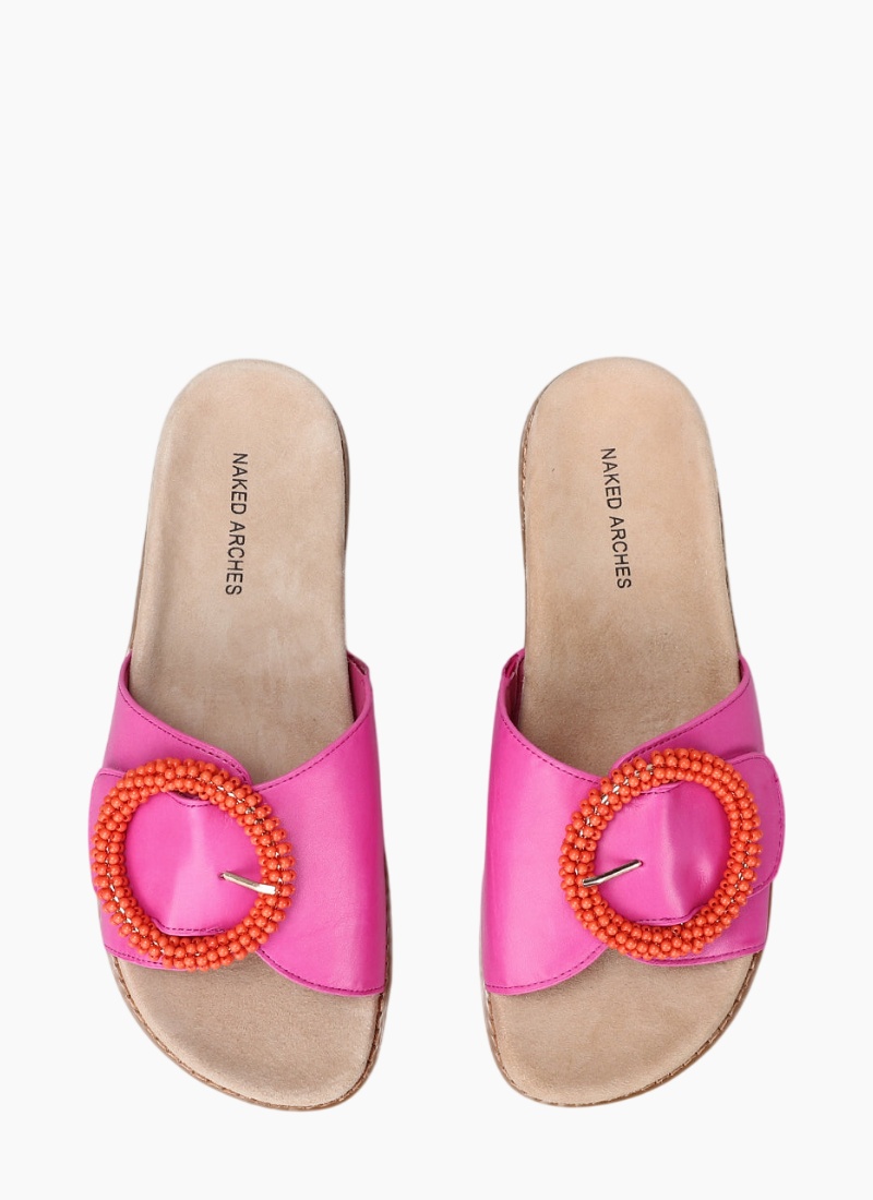Introducing the NAKED ARCHES ZOYA HOT PINK from NAKED ARCHES. This vibrant slide sandal brings a playful, fashion-forward finish to any summer wardrobe.