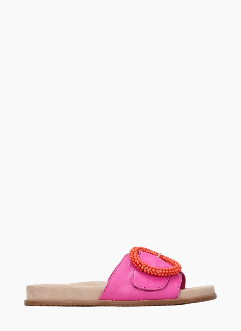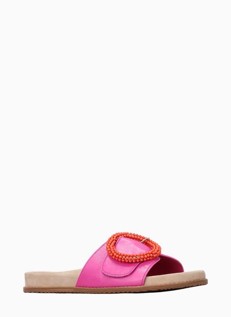 - Crafted with a hot pink leather upper and a bold orange beaded buckle for a statement look