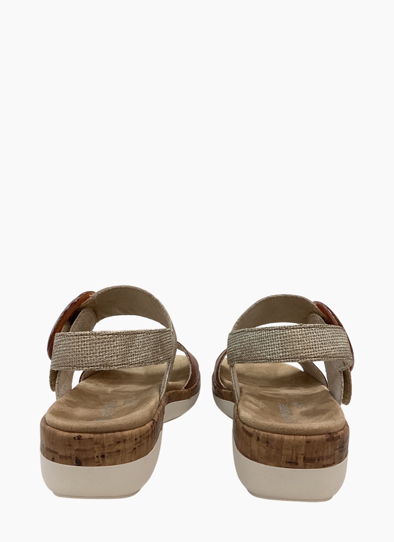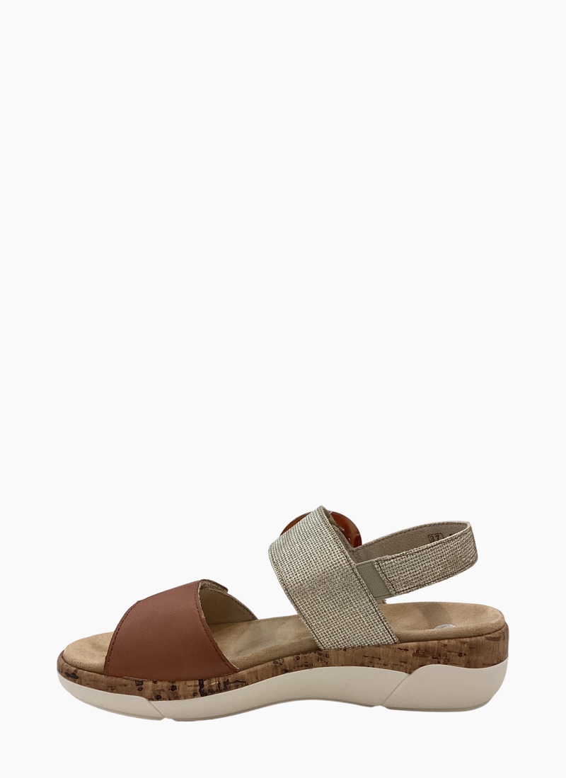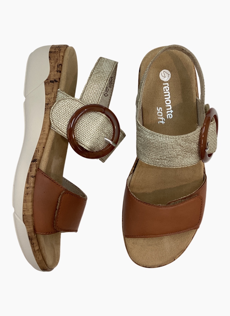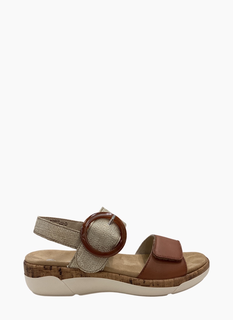 ORTHOTIC FRIENDLYIntroducing the Remonte R6853-90 Sandal Tan/Gold. A versatile, comfortable sandal that blends effortless style with everyday support. *Crafted from soft tan leather and woven textile with a cushioned FULLY REMOVEABLE FOOTBED and cork like midsole. *Adjustable front velcro strap and elastic gusset back heel strap with a statement round buckle on velcro for easy on-and-off * Lightweight, shock-absorbing sole with a grippy rubber outsole for confident summer walks *Rich tan colour and mixed-material finish make this leather and textile sandal an elegant match for linen dresses, cropped pants or casual denim.