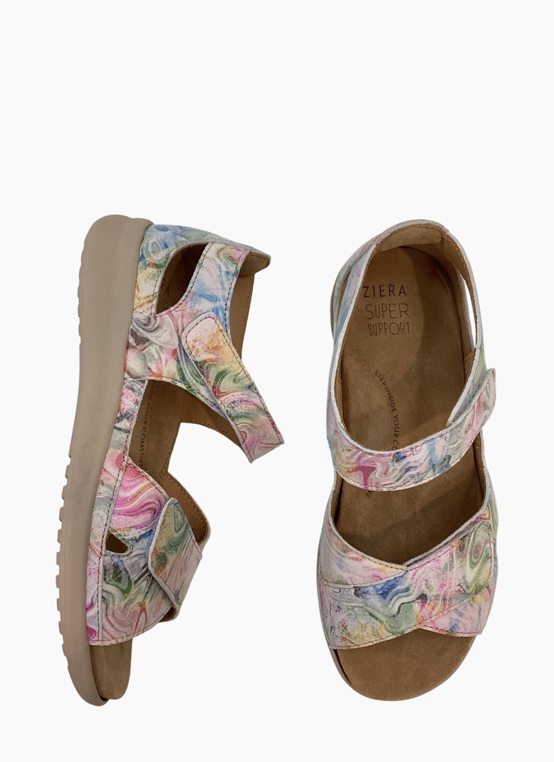 ORTHOTIC FRIENDLY- PODIATRY FRIENDLYIntroducing the Bronn XW Nude Floral from Ziera. This breezy sandal is a pastel floral statement crafted for everyday comfort and effortless summer style. *Width: Extra Wide. *Footbed: Super Support. *Fit Notes: Wider Fit with a little more room over the Instep. * Removable Super Support Footbed. *Wider Heel with deeper Stabilizing Fit. * High Arch Support. *Velcro Straps Provide an easy, adjustable fit.
