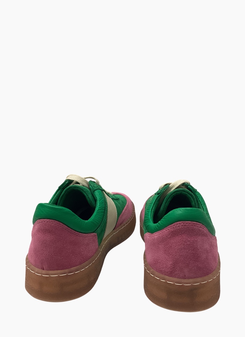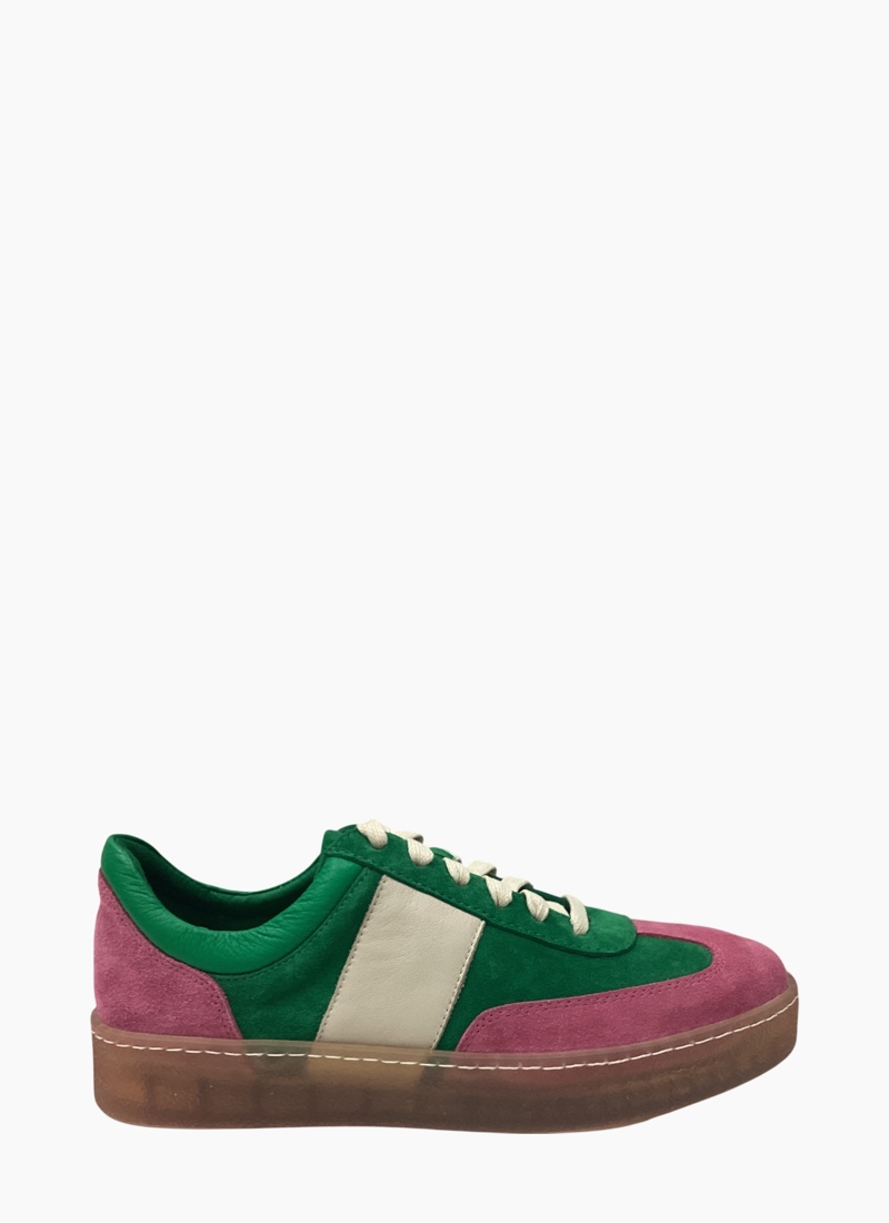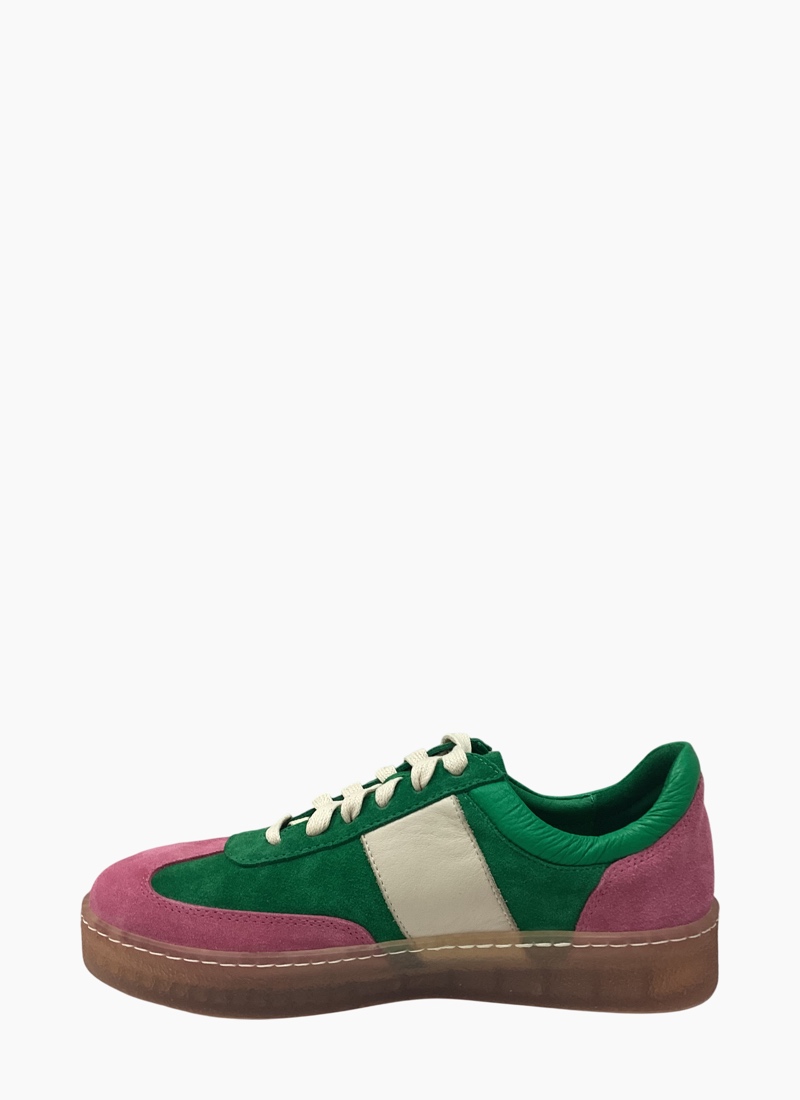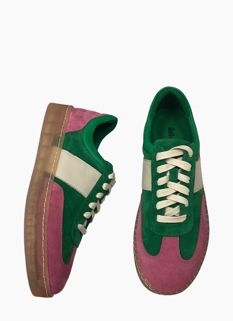 Introducing the Belle Scarpe Reomee Sneaker Green Combo. This playful low-profile sneaker brings a vintage-meets-modern feel in a bold green and pink colourway.