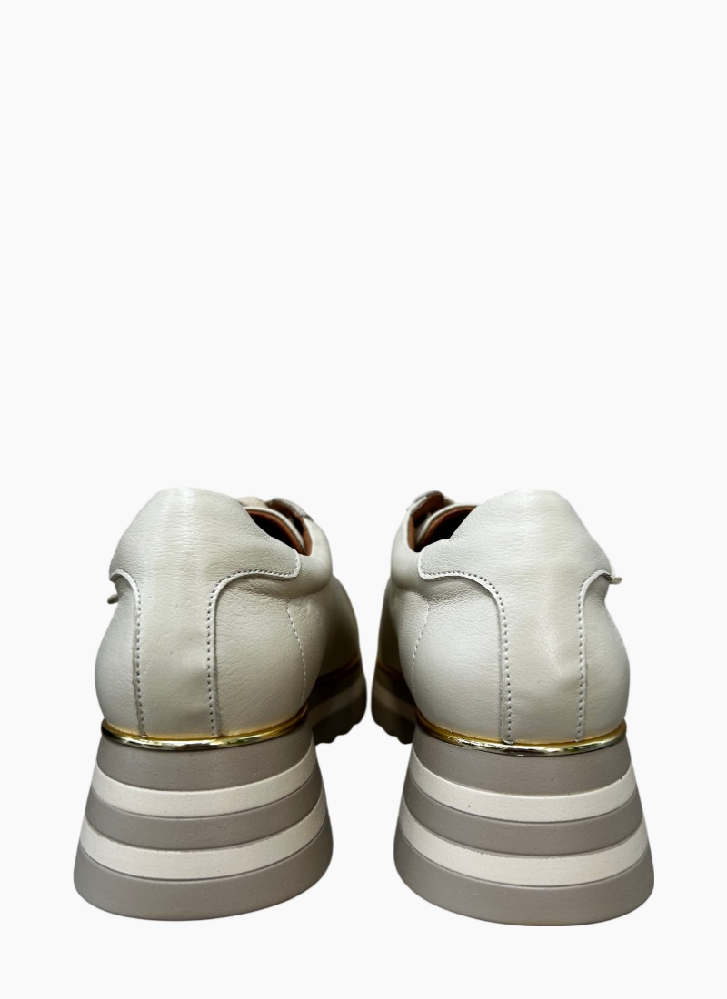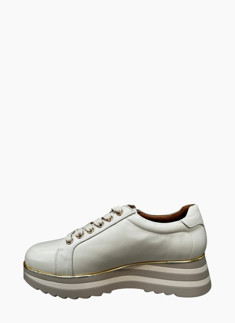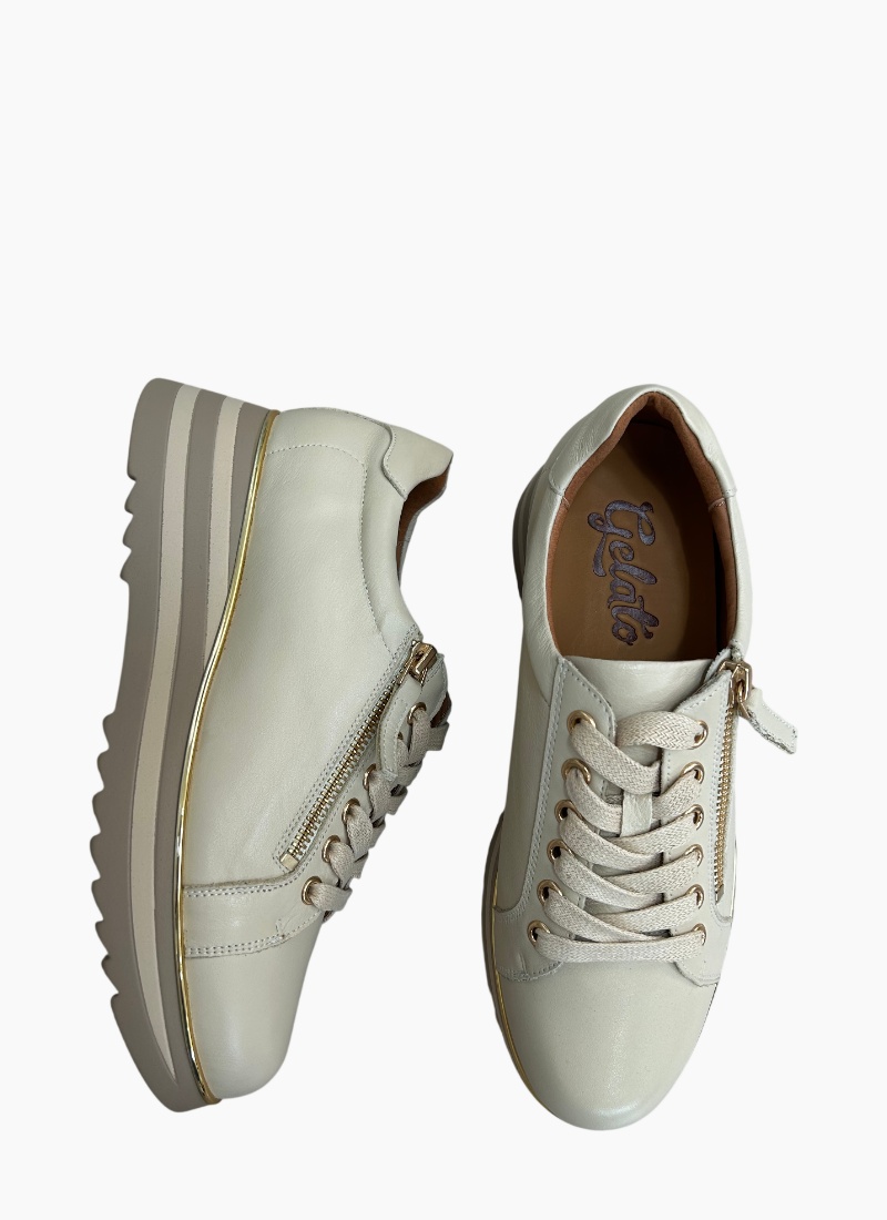 Introducing the Gator Lace up Platform Swan from Gelato. This contemporary women's sneaker brings understated luxury to everyday wear with its creamy ivory tone and sculpted platform sole.