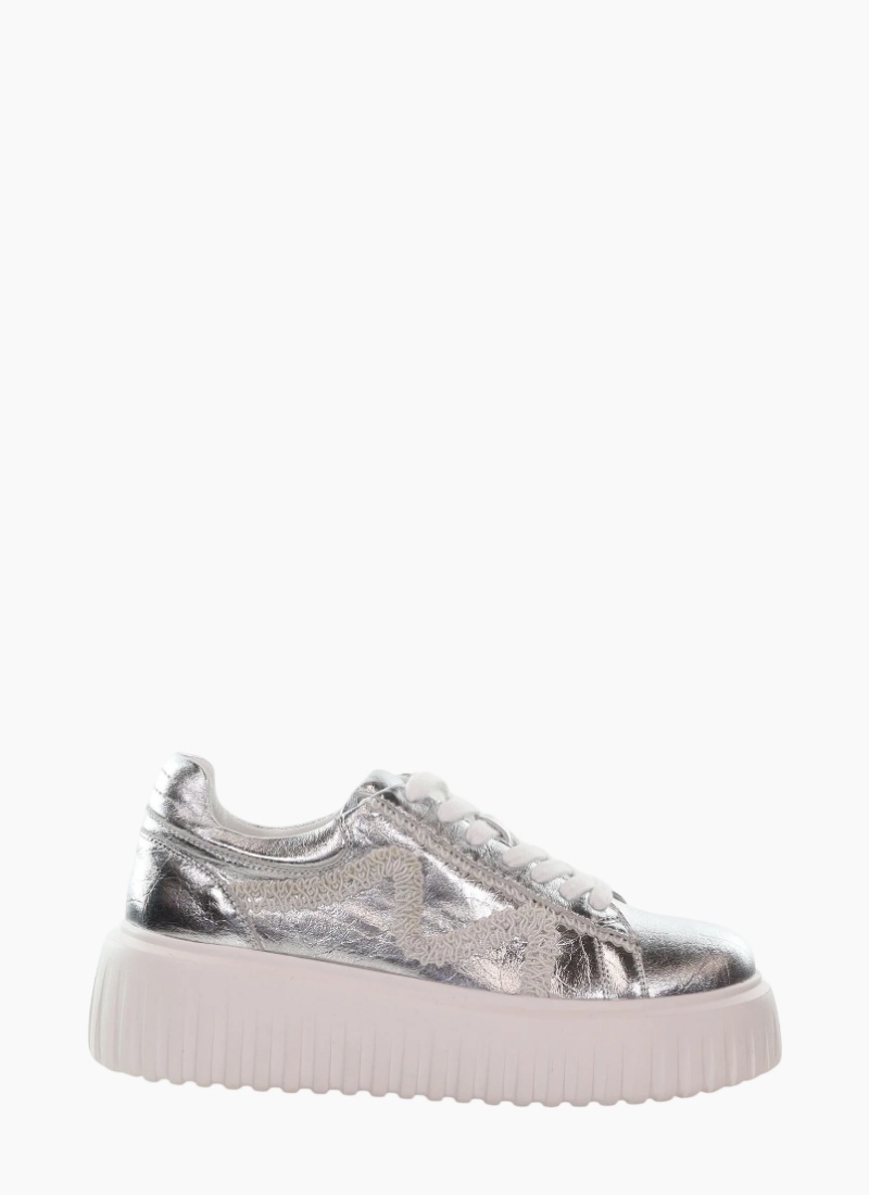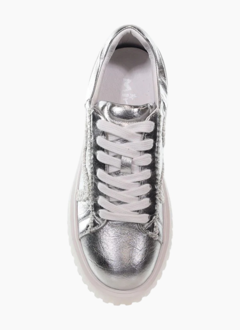 Introducing the Drax Sneaker from Minx. This silver metallic sneaker features a playful scrunch lace detail and a chunky ridged sole for contemporary everyday style.