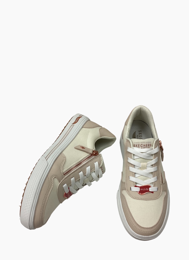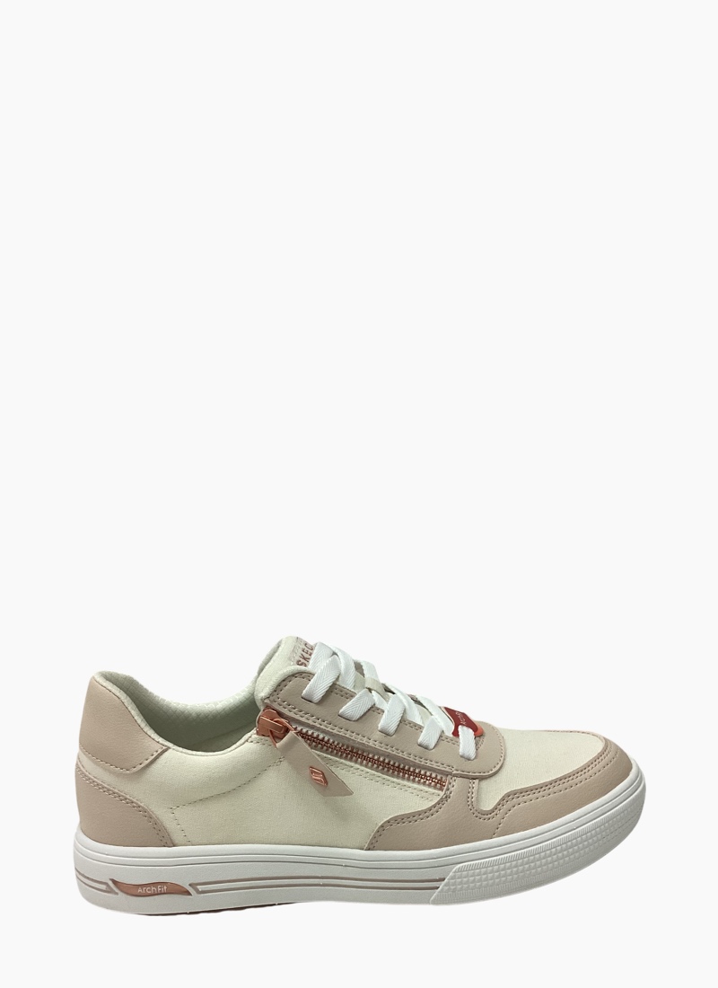 Timeless style and supportive comfort combine in Skechers Street™ Arch Fit® Arcade - On The Fly. This sneaker features a lace-up synthetic duraleather upper with canvas. Featuring a side zip closure and a removable Arch Fit® insole with Skechers Air-Cooled Memory Foam® technology.
