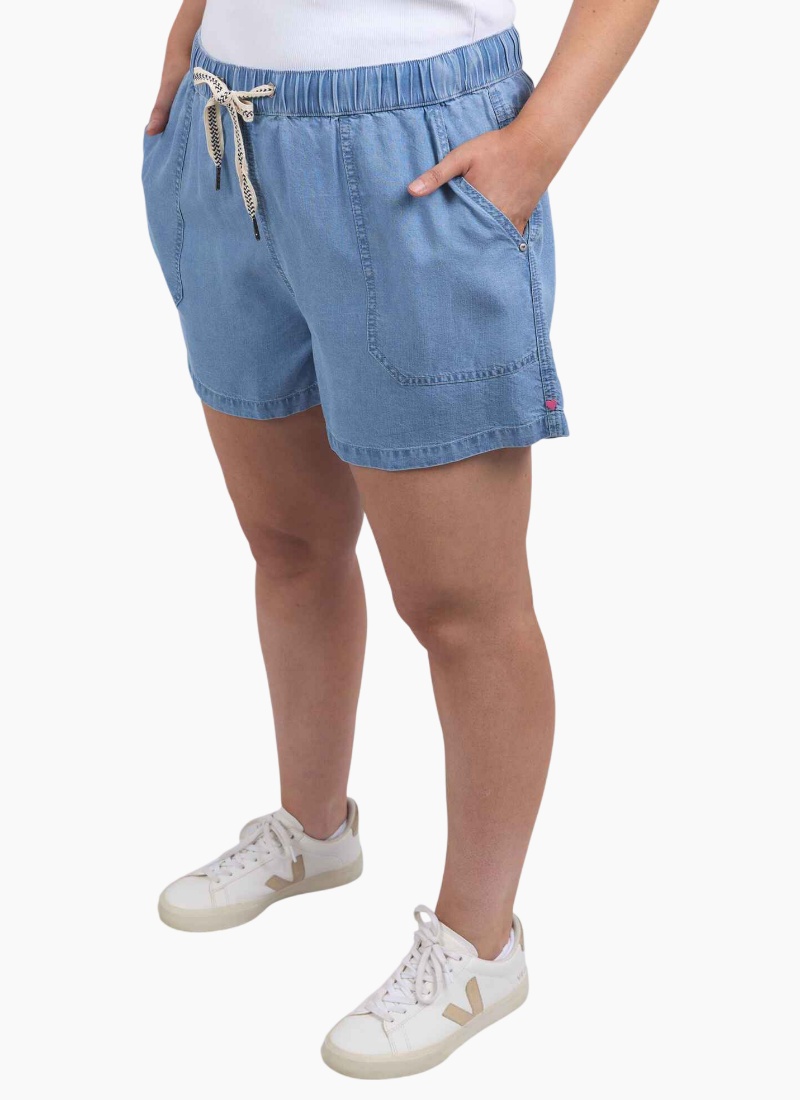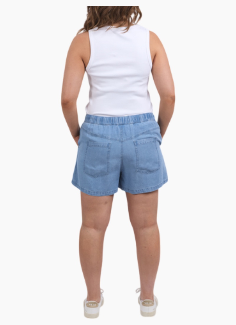 Introducing the Elliot Chambray Short from Elm. These casual shorts are a breezy wardrobe staple in a soft chambray blue.