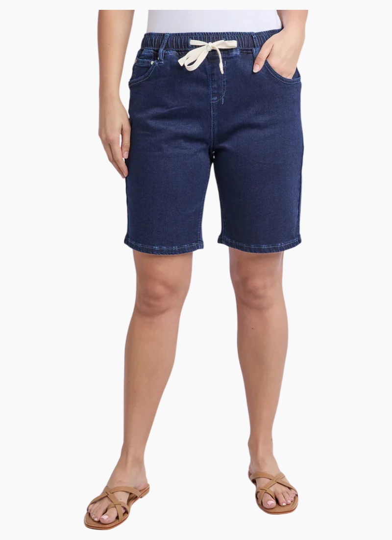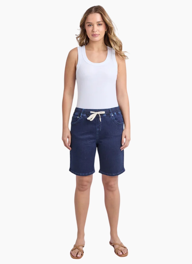 Super flattering and offering next level comfort, the Gabby Bermuda length shorts feature a elasticated waist with drawstring and a mid rise for tummy hugging comfort. These high-stretch denim shorts have a relaxed leg and you'll want to live in them, we promise!Elastic waist with draw cord Knee length Side pockets Stretch denim 94% Cotton, 4% Polyester, 2% Elastane Model is wearing a size 10