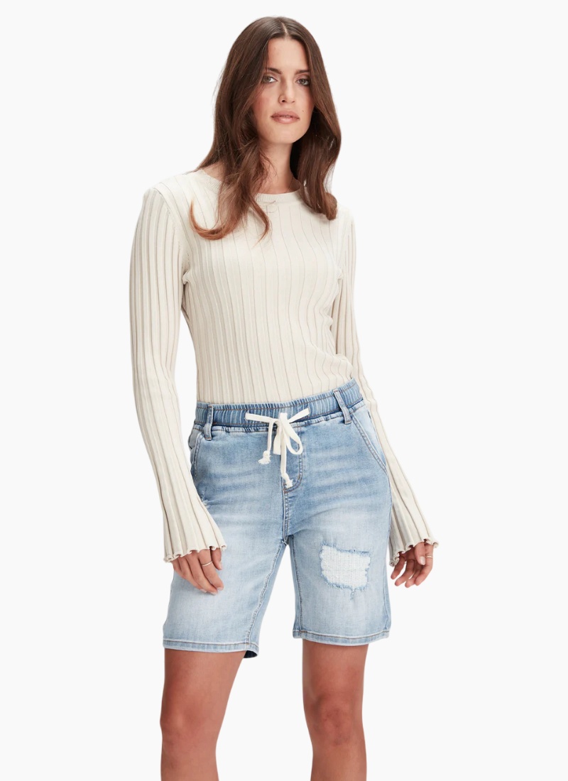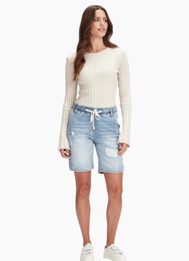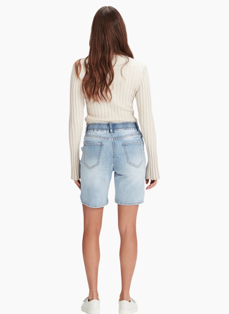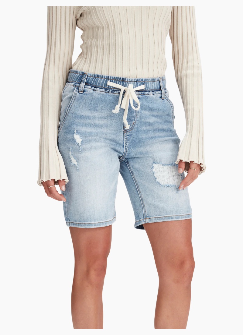 Mid or high waisted long shorts with a super comfy soft stretch denim. The main rip is patched and crossed stitched to give you that ripped look but without the hole. A great relaxed fit summer short with distressed front panels. Can be worn higher or lower on the waist as preferred. Elastic waist band with a shoe string tie and belt loops 70.5% cotton, 27.5% polyester, 2% spandex, zip fly, 4 pocket design. Rips and holes will naturally continue to grow. Model height 171cm and wears her normal size XS(8) Colour: Blue Length: approx. 46cm measured from side of waist band to hem. Fits true to size: Select your normal size