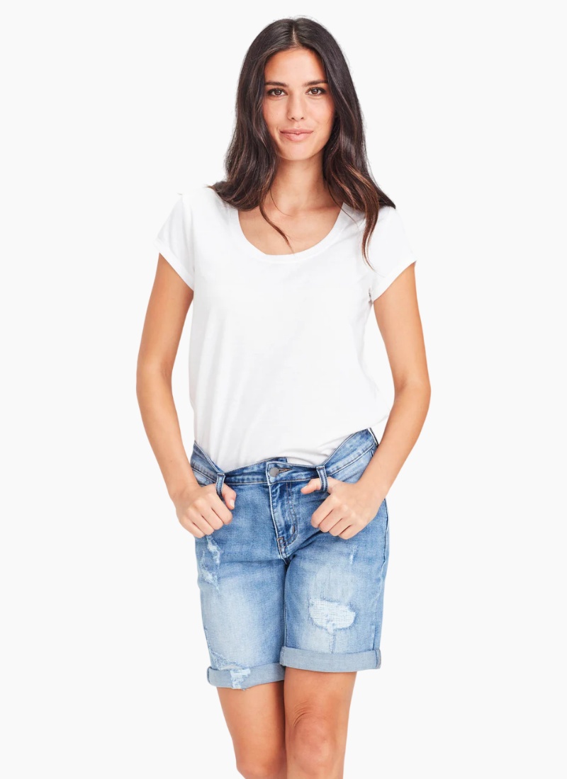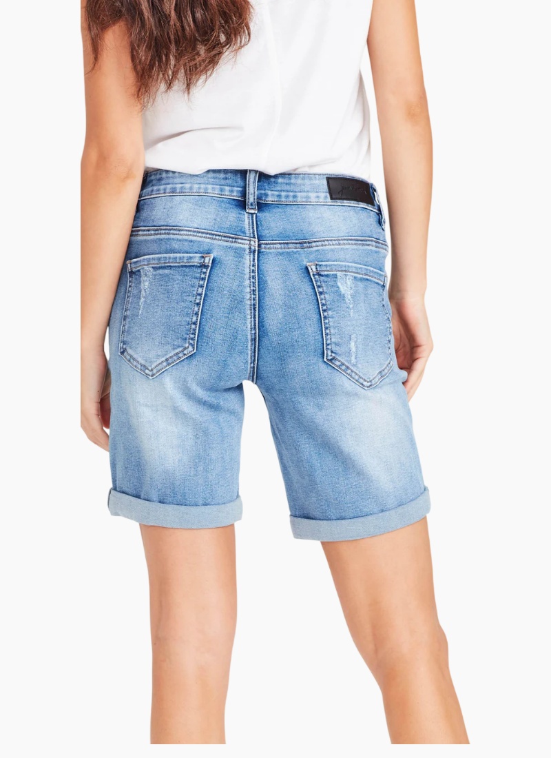 Mid waisted long shorts with a super comfy soft stretch denim and a rolled cuff.The main rip is patched and crossed stitched to give you that ripped look but without the hole. A great relaxed fit summer short with distressed front panels and light distressing on the rear pockets. Check out our video below. Fixed waist band, belt loops, 70.5% cotton, 27.5% polyester, 2% spandex, zip fly, classic 5 pocket design. Rips and holes will naturally continue to grow. Model height 173cm and wears her normal size XS(8) Colour: Blue Length: approx. 45cm with rolled cuff or 49.5cm with cuff rolled down, measured from side of waist band to