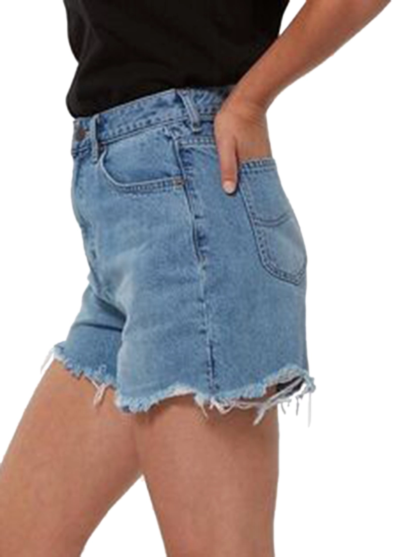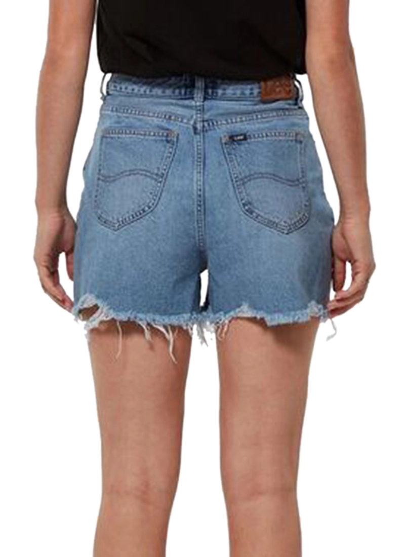 The new High Relaxed short is exactly that - a high rise fitted waist short with relaxed body and leg. Finished in a mid blue stonewash rigid denim, with wheat stitch raw destructed hem.