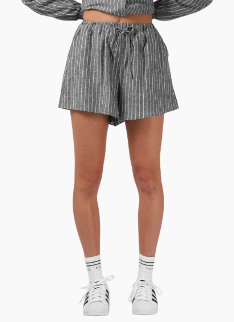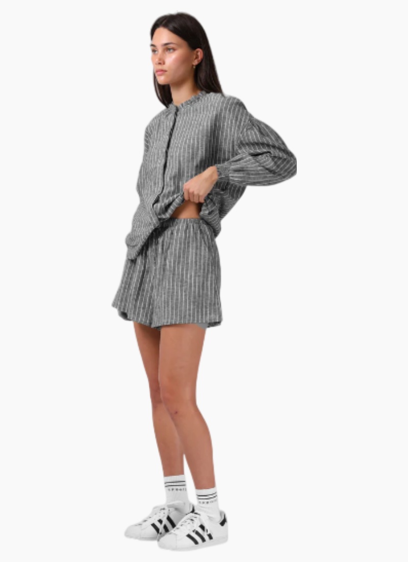 Introducing the TILLY SHORT from RPM. These relaxed grey pinstripe shorts are crafted to pair seamlessly with the matching shirt for effortless, elevated casual wear. 55% Linen / 45% Cotton, Lightweight Material, Relaxed Fit, High Waisted, Elasticated Waist, Drawstring Tie Detailing