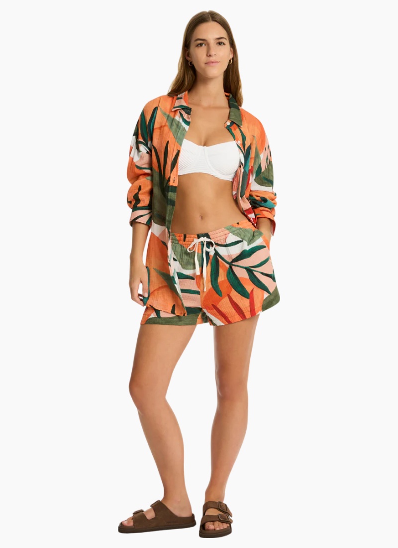 - Vibrant tropical print in peach, forest green and coral-orange adds instant holiday colour