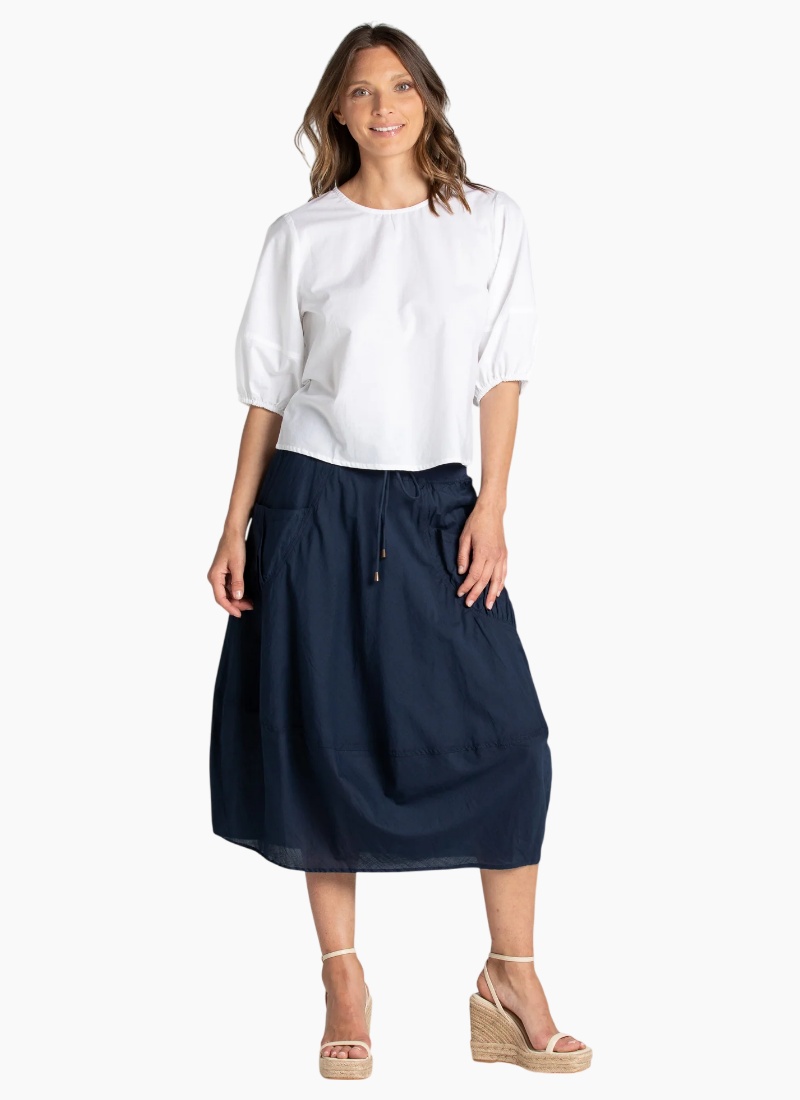- Navy from Boom Shankar. A breezy, mid-length navy skirt that brings relaxed, everyday elegance to your wardrobe.