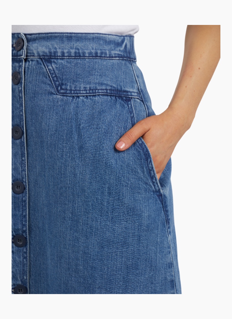- Knee Length silhouette in a versatile denim blue that pairs effortlessly with tees, knitwear or heels