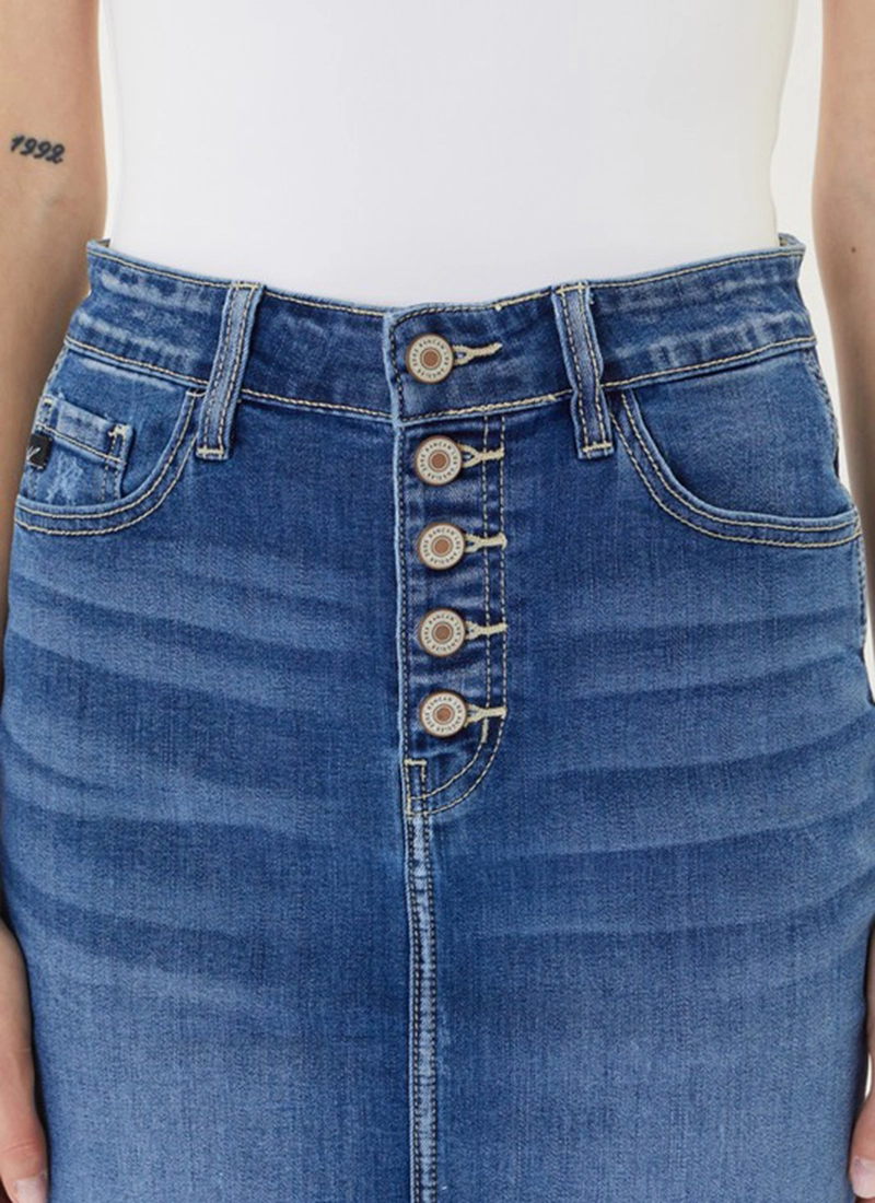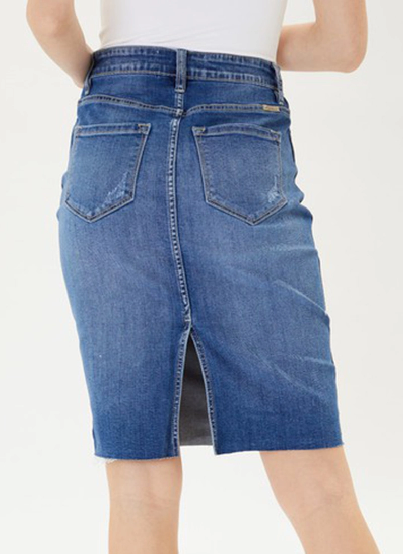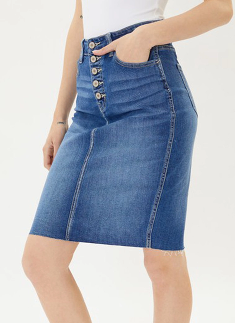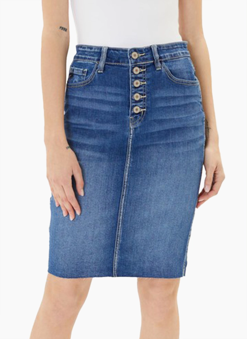 Build out your arsenal of denim staples with a figure-hugging denim skirt neatly shut with a button front and softly faded to perfection.