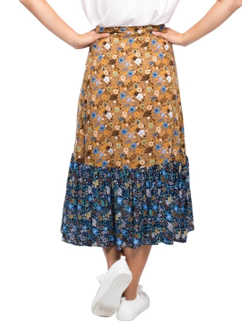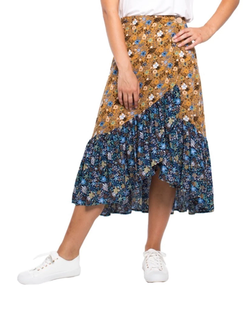 A two tone sweet floral print brings a feminine flair to this wrap, button up skirt, with ruffle high-low hem.