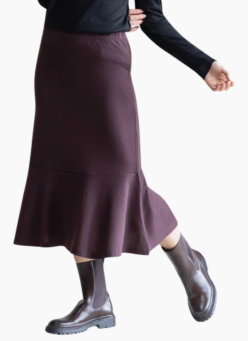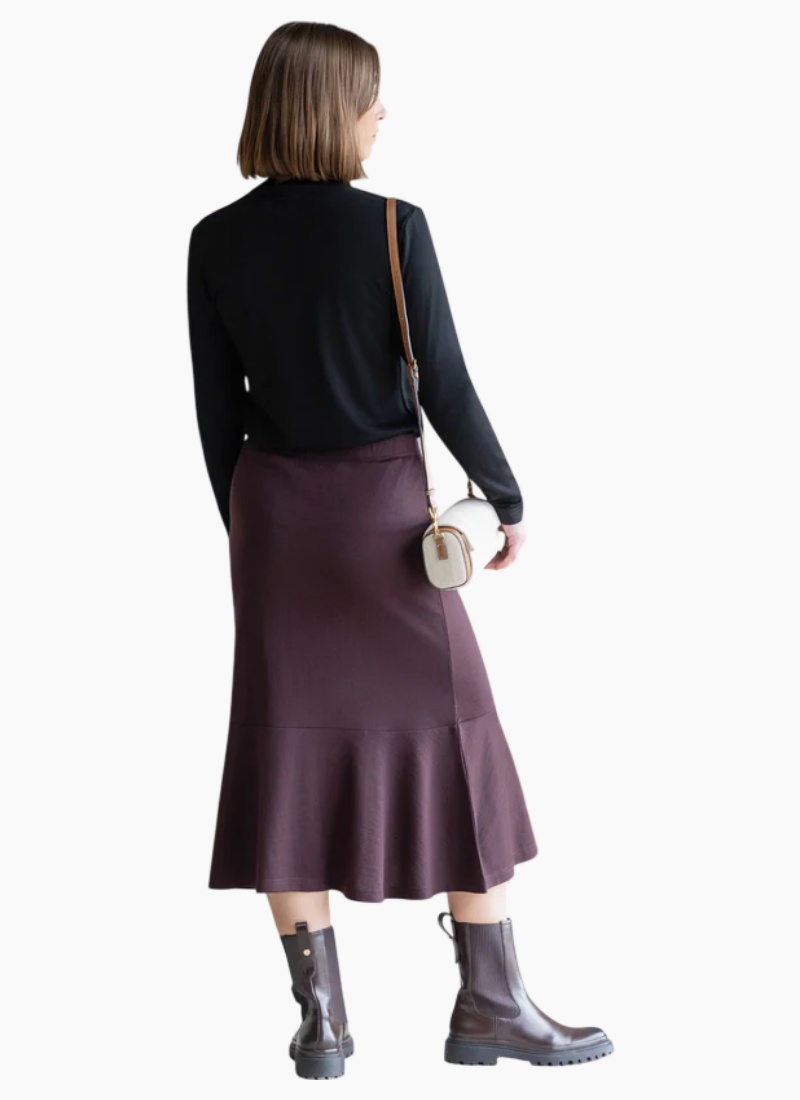 Midi-length merino skirt in Berry - a rich dark plum tone. Designed with a slim fit through the hips and a softly flared peplum hem, this style offers comfortable movement and an easy, flattering silhouette.