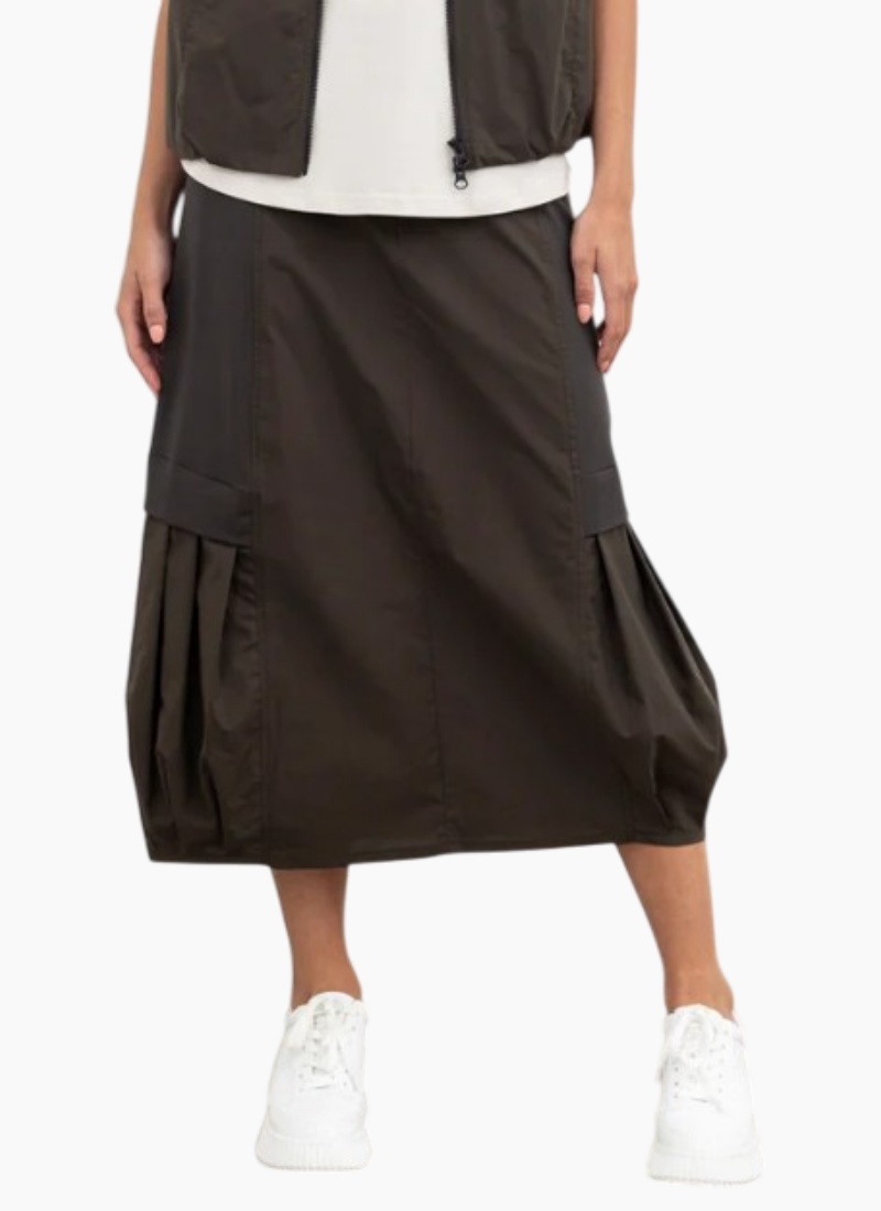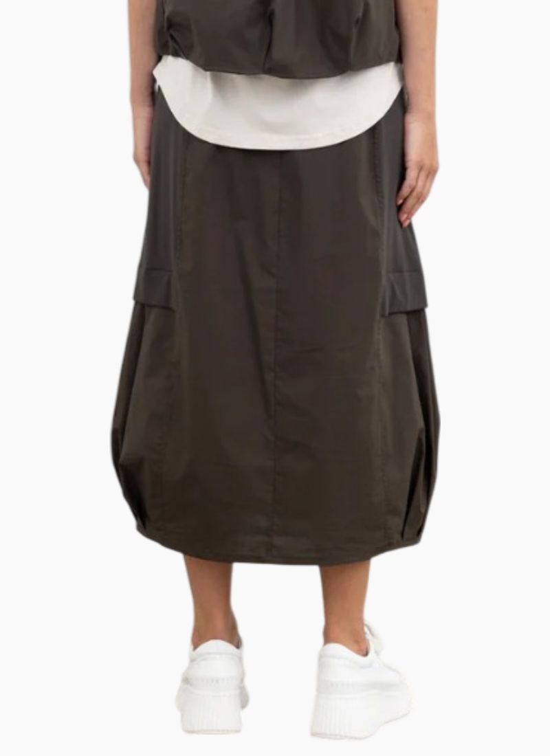 Introducing the Conscious Skirt Olive from X Lab. This knee-length skirt balances sculptural detail with everyday ease for a contemporary, wearable finish.