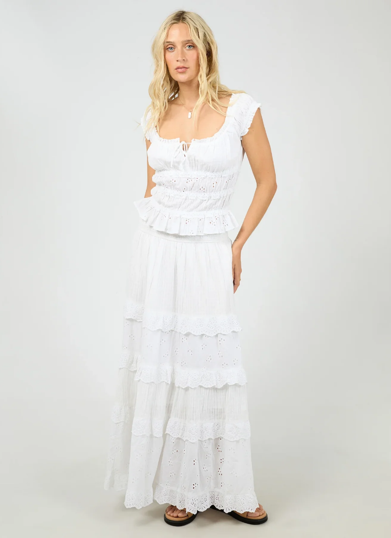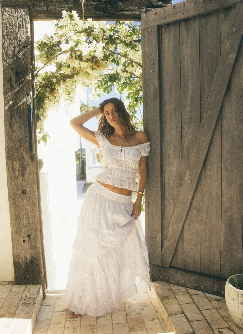 Light, airy, and feminine - the Rain Maxi Skirt is crafted from white cotton with delicate woven broderie detailing. With its flowy silhouette and soft tiering, it’s made to move with you from slow mornings to golden-hour strolls. Pair it with the matching All About Eve Rain Short Sleeve Top for a dreamy coordinated look, or style with a tucked-in tank for a relaxed, boho-inspired outfit.