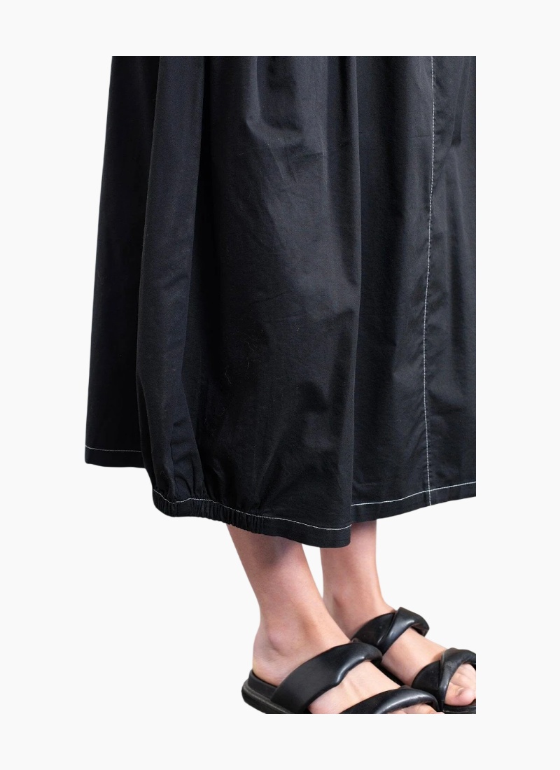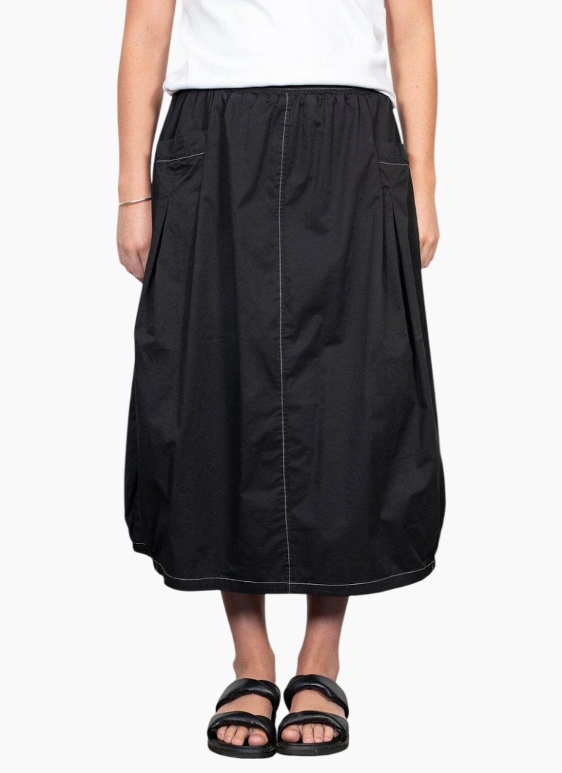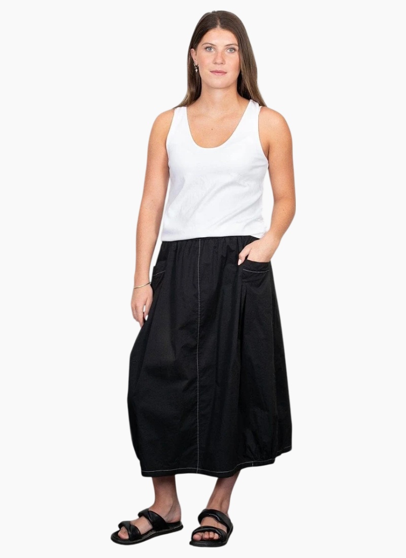 The Cyrus Skirt in Black Contrast is your new go-to for casual wear. Crafted from lightweight, breathable cotton, this skirt features a relaxed A-line silhouette with a subtle balloon hem for added volume and movement.Designed with comfort in mind, it boasts an elasticated waistband for a flattering fit and roomy side patch pockets. Perfect for everyday wear, weekend outings, or travel, the Cyrus Skirt combines comfort, utility, and modern design in one piece. 100% Cotton
