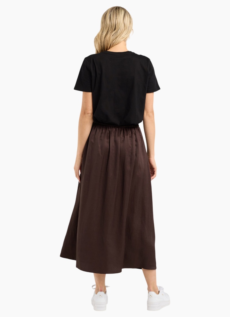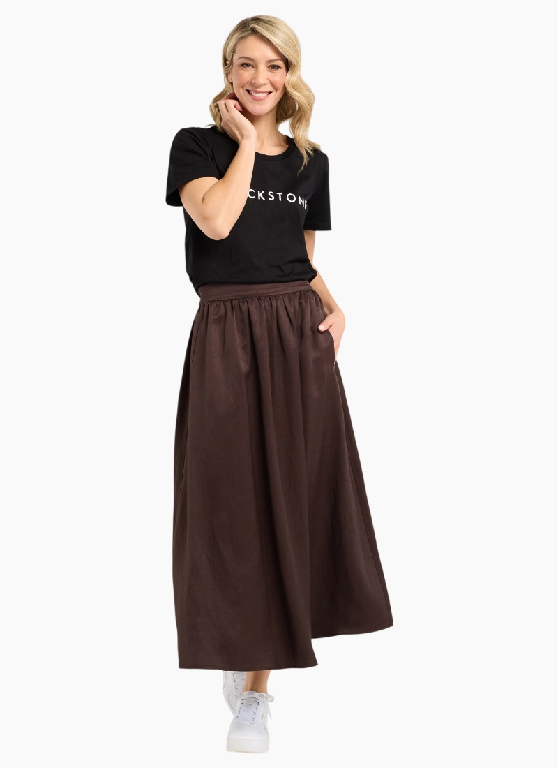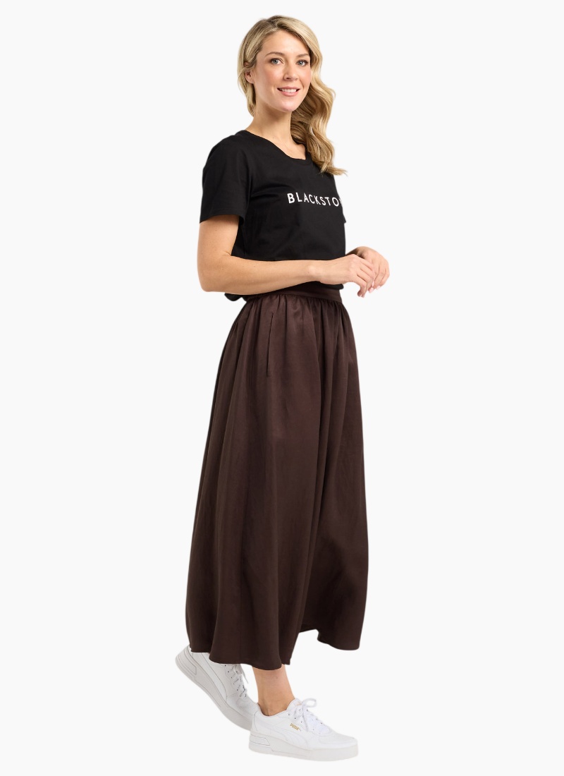 Feel fabulous in Blackstone's Edith Midi Skirt a versatile addition to any wardrobe. Crafted from a textured viscose linen blend, this skirt balances refined polish with easy wearing comfort the gathered front and midi length creates a flattering silhouette perfect for transitioning from daytime errands to evening plans. Flat front waistband with gathered detail, elasticated at back Slit pockets no side-front panel seams