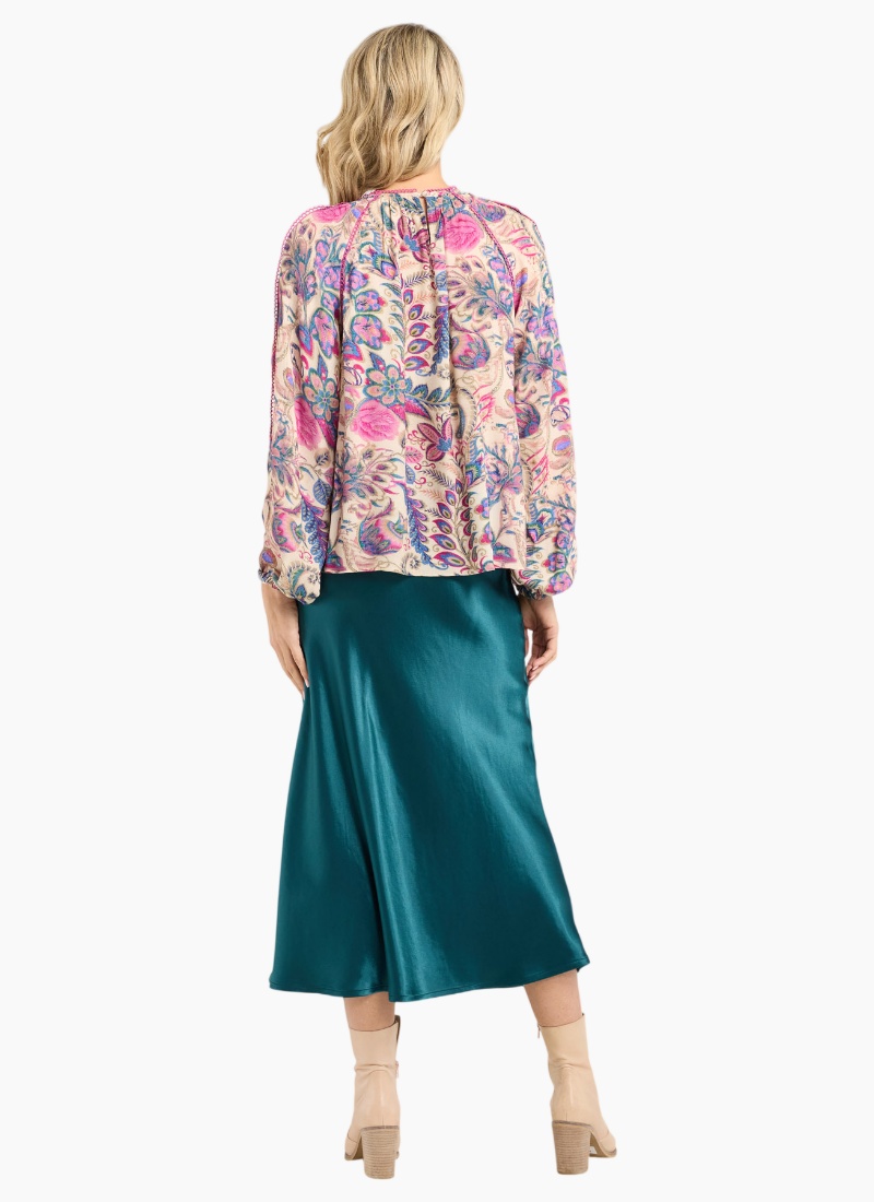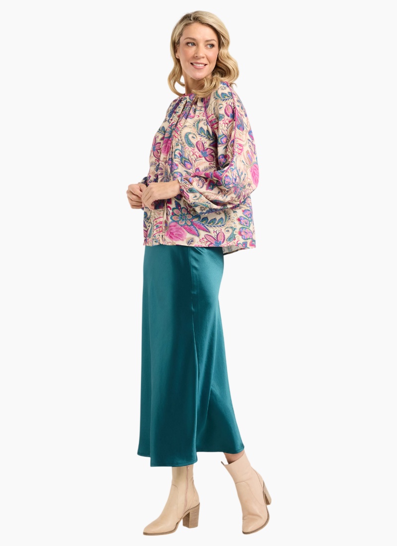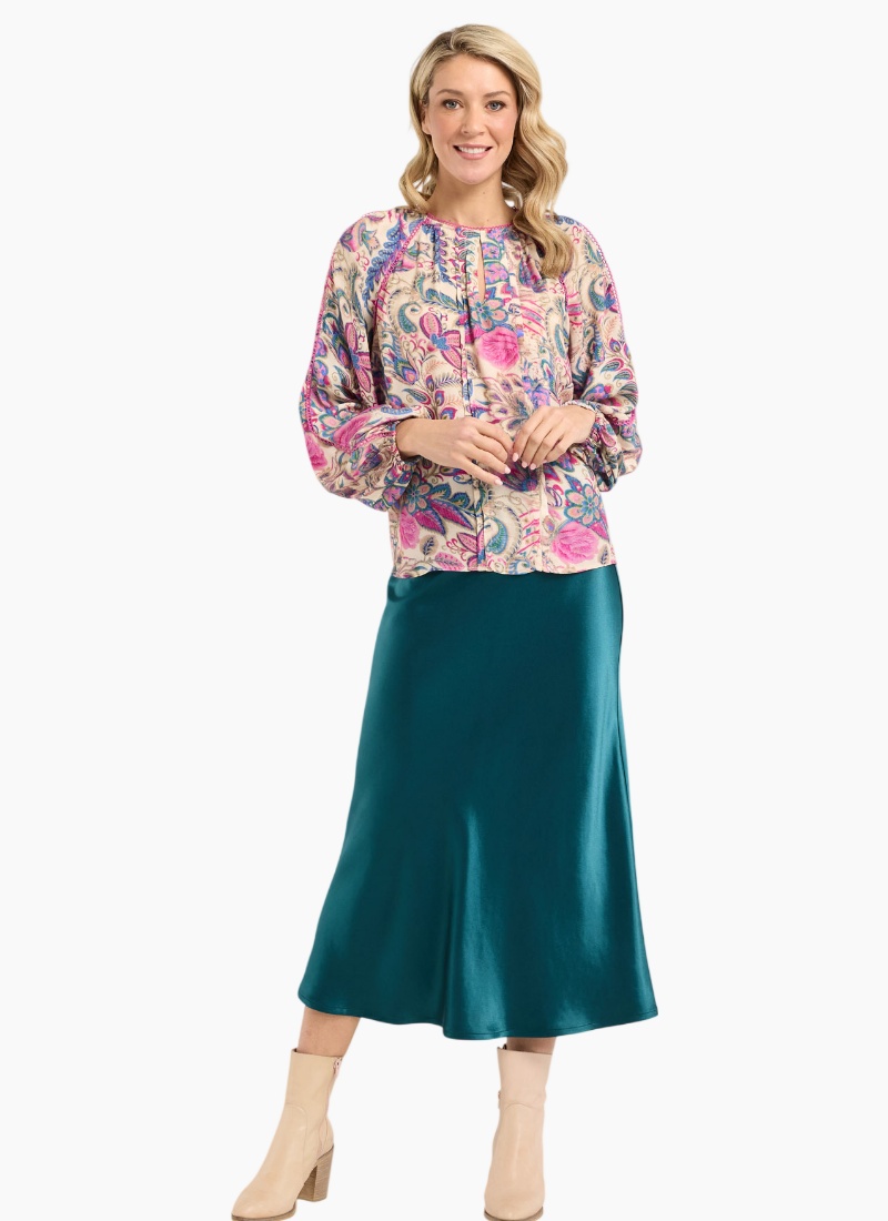 Introducing the Elliana Satin Skirt from Blackstone. This lustrous teal skirt offers a fluid silhouette and a satin sheen that elevates both day and evening looks.