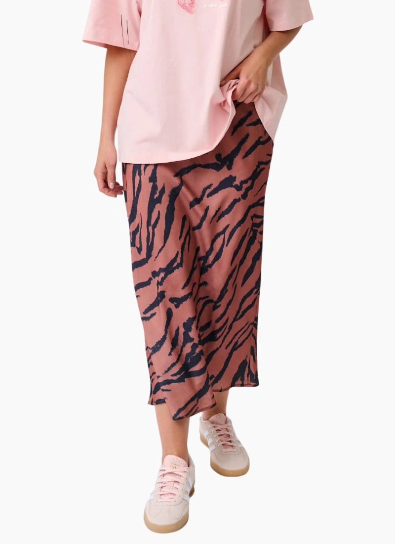 Introducing the Carys Skirt from Cartel & Willow. This elegant slip-style maxi skirt blends a striking tiger-inspired print with a fluid satin drape.
