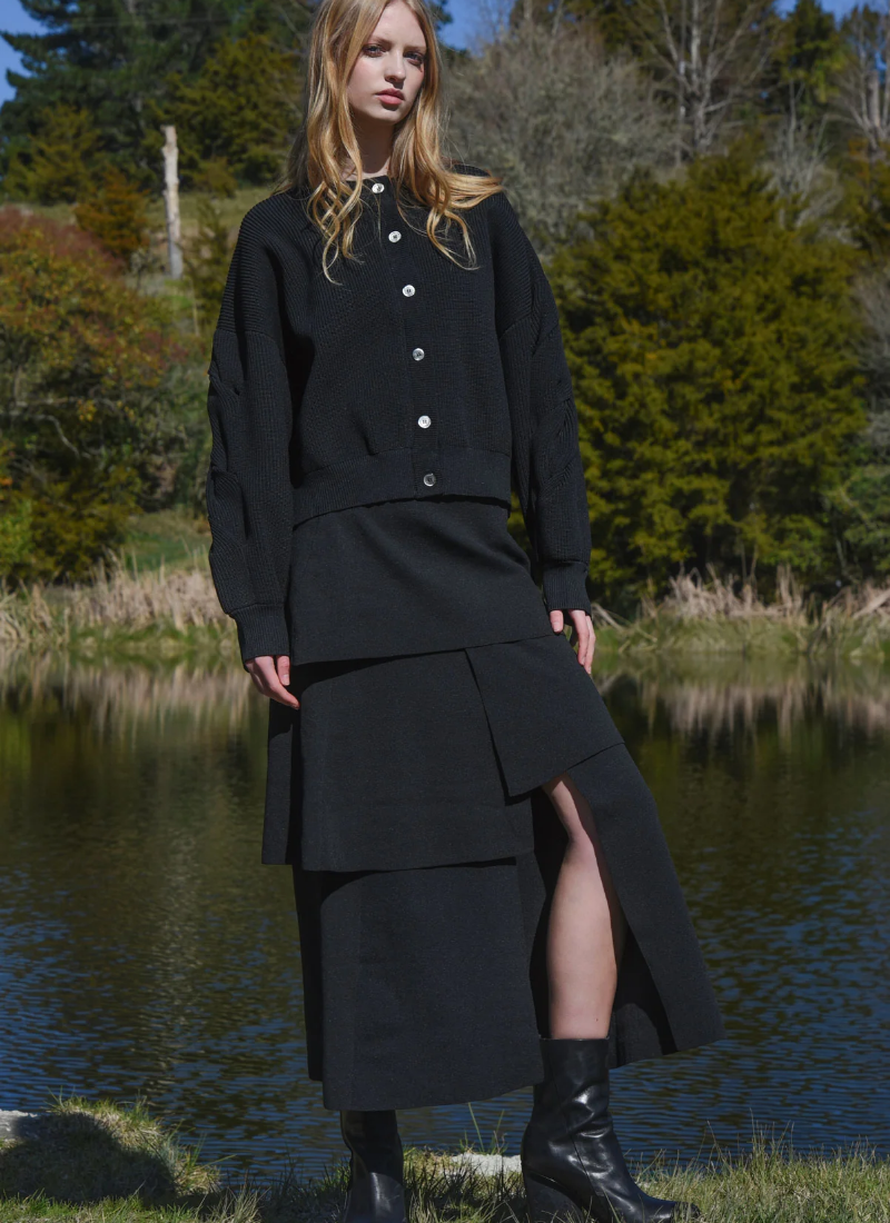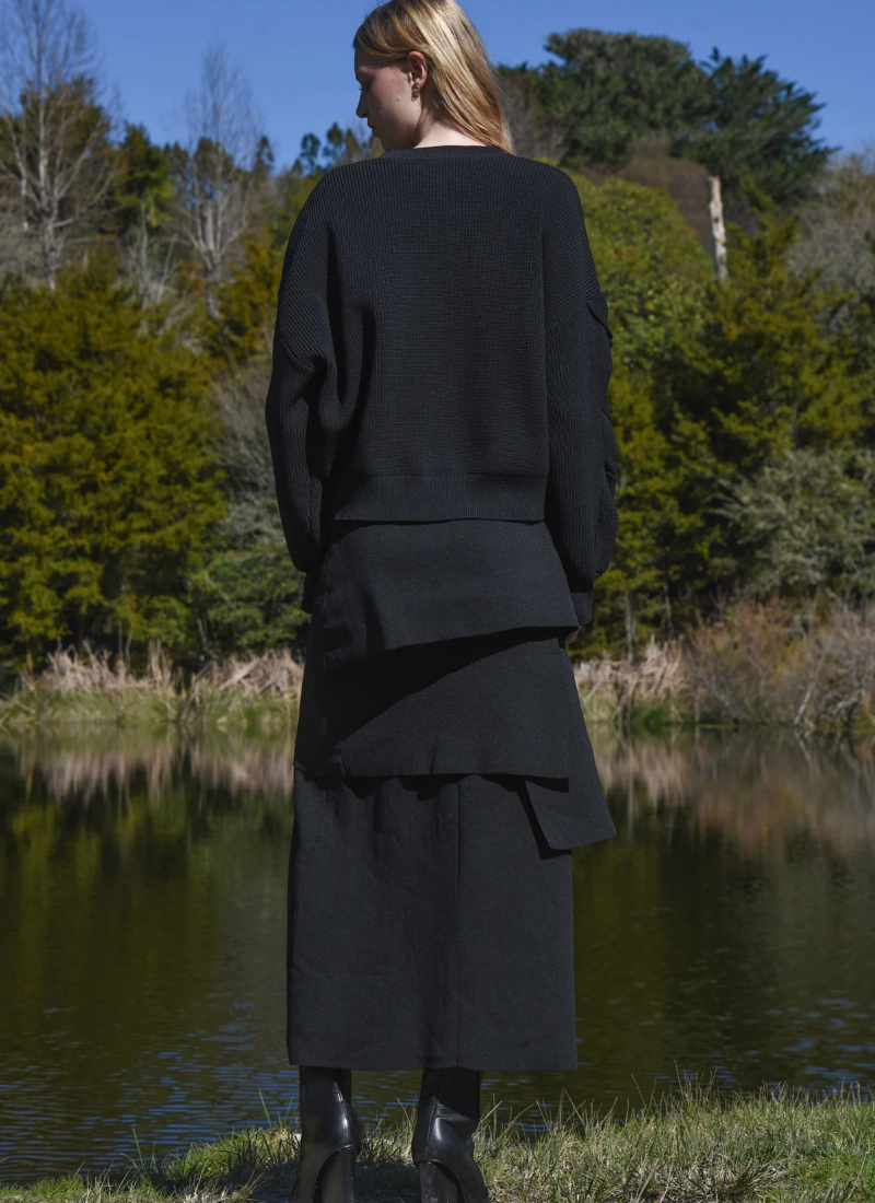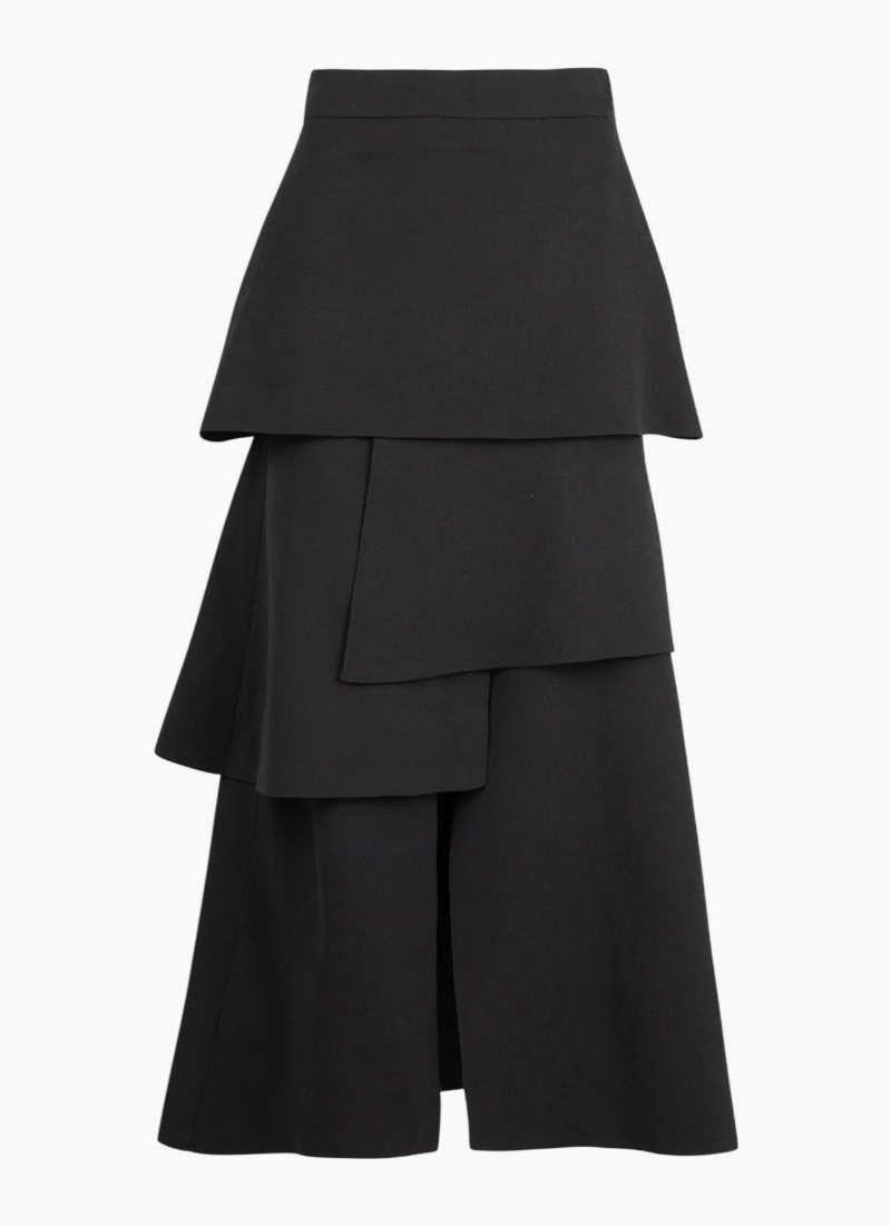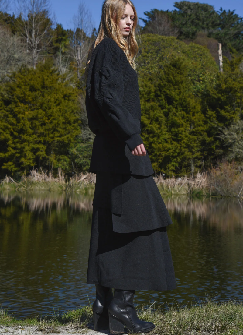 Introducing the Layers Of Love Skirt - Knit's The Limit Black from COOP. This tiered knit maxi offers sculptural movement and a refined, contemporary edge.