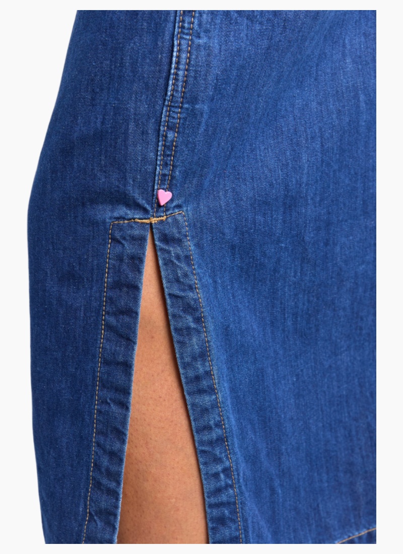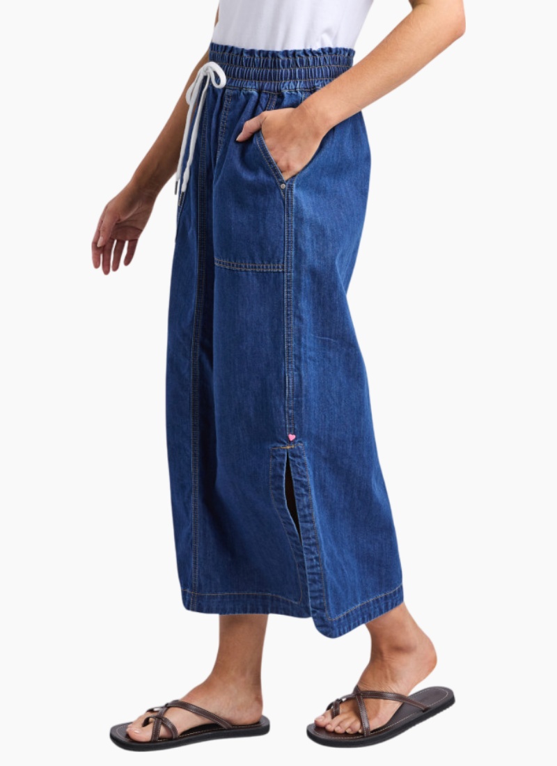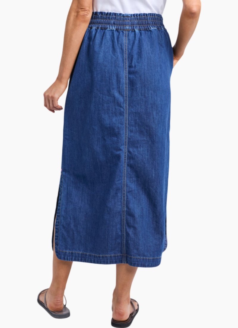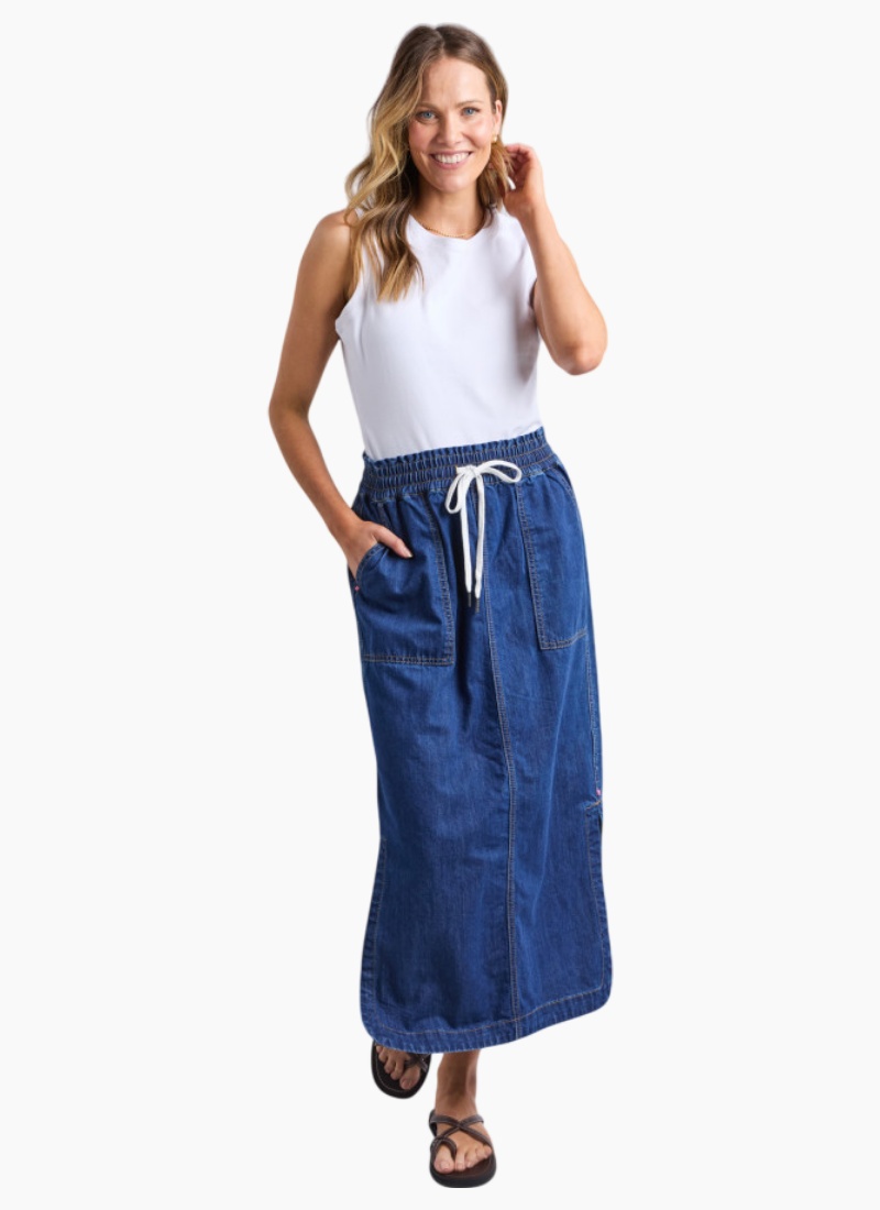 For those that like their skirts a little longer the new Clover Skirt will be perfect. This light-weight denim maxi skirt features a lovely curved hemline, pockets and is made from 100% cotton denim.Wide elastic waist with drawcord Patch pockets with top stitching Curved hemline (mid weight Chambray)