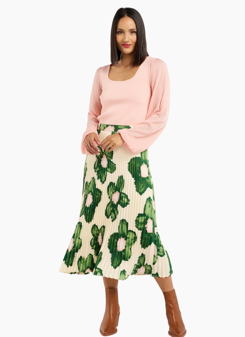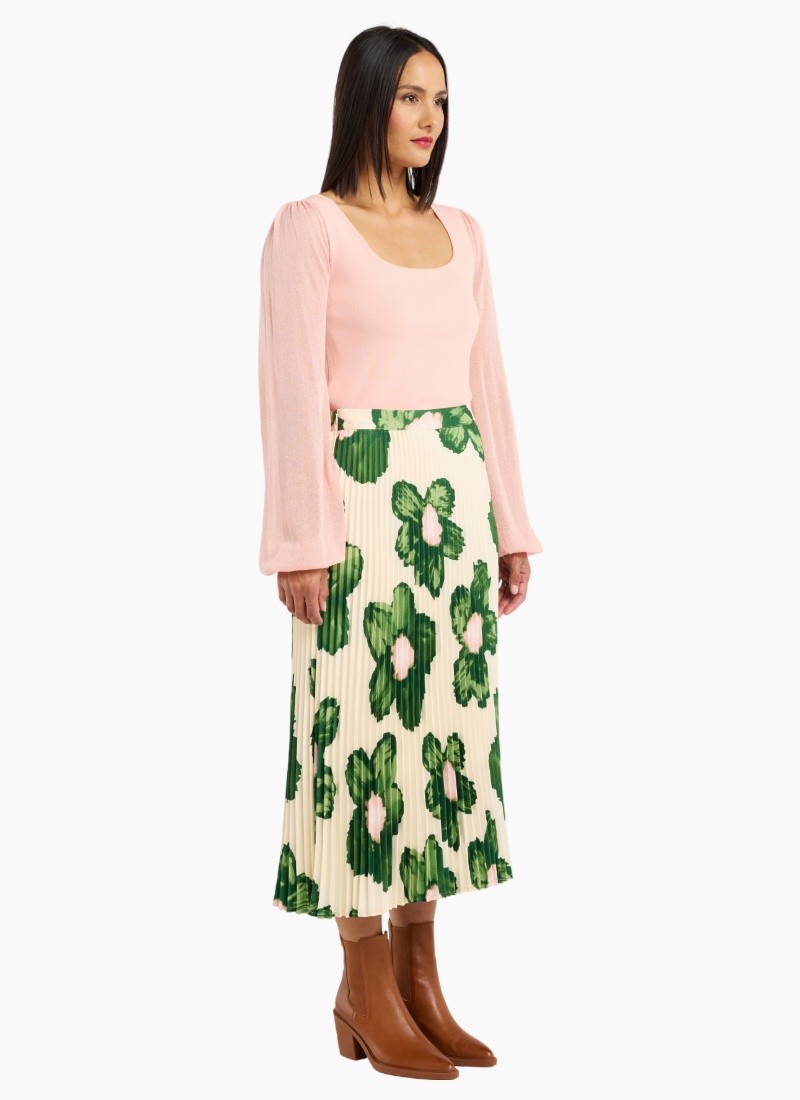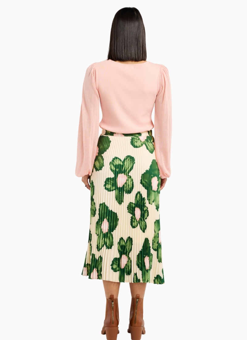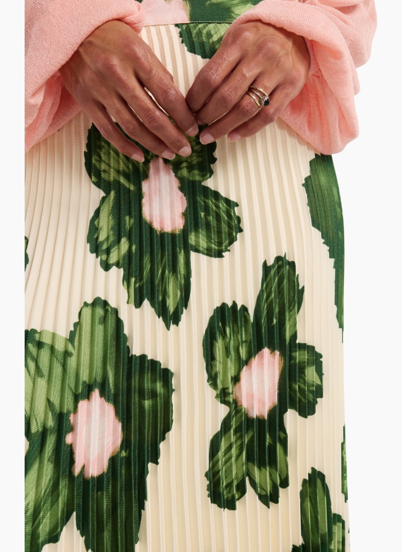 - Pleated midi silhouette in a cream base with oversized green daisy motifs for a striking colour story