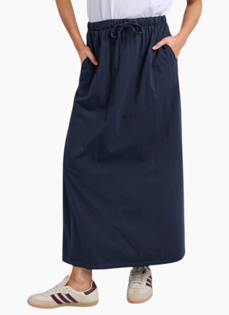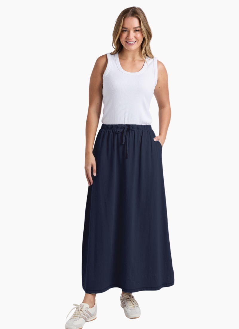 Introducing the Evolve Skirt from Foxwood. A relaxed, everyday maxi skirt in a deep navy that offers effortless movement and understated style.