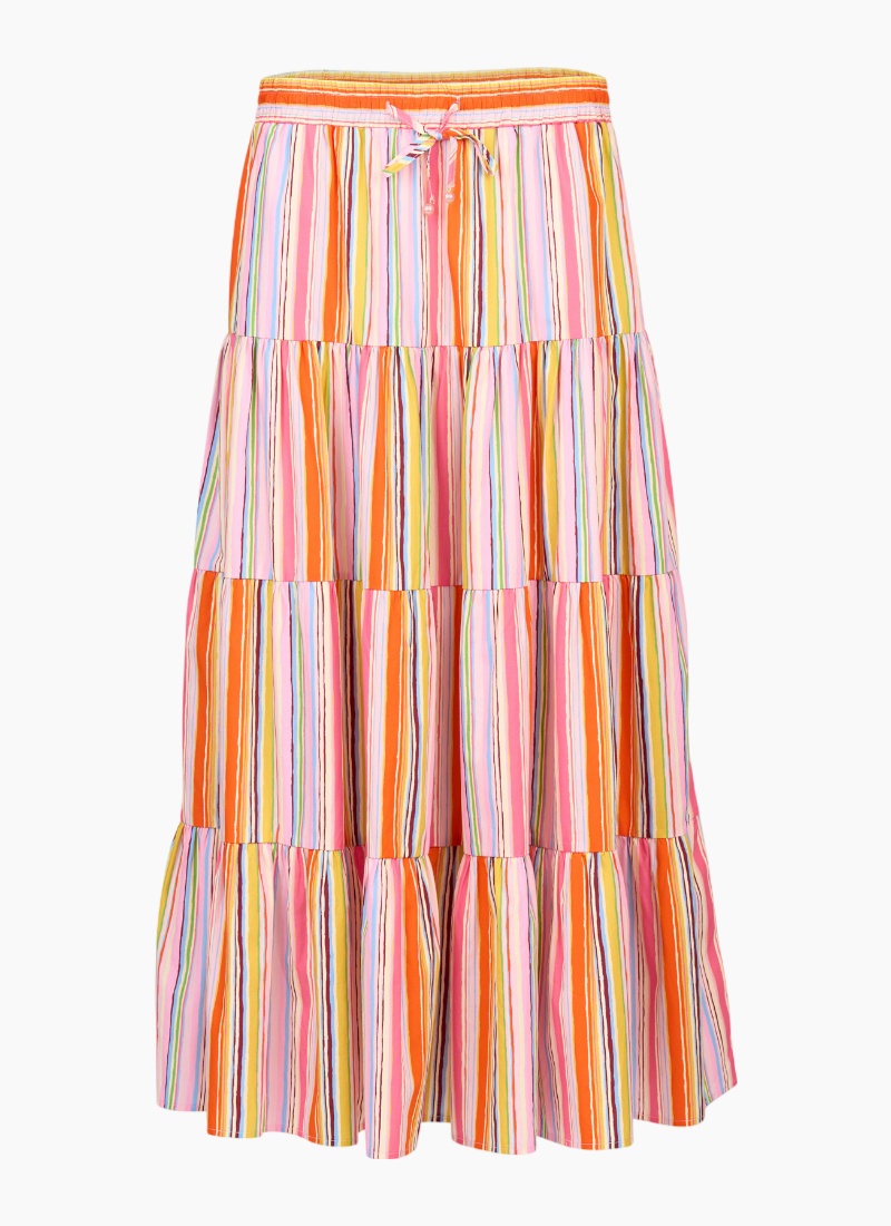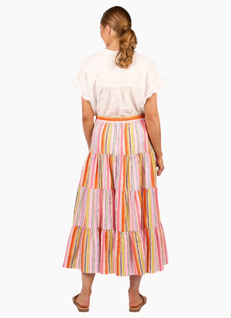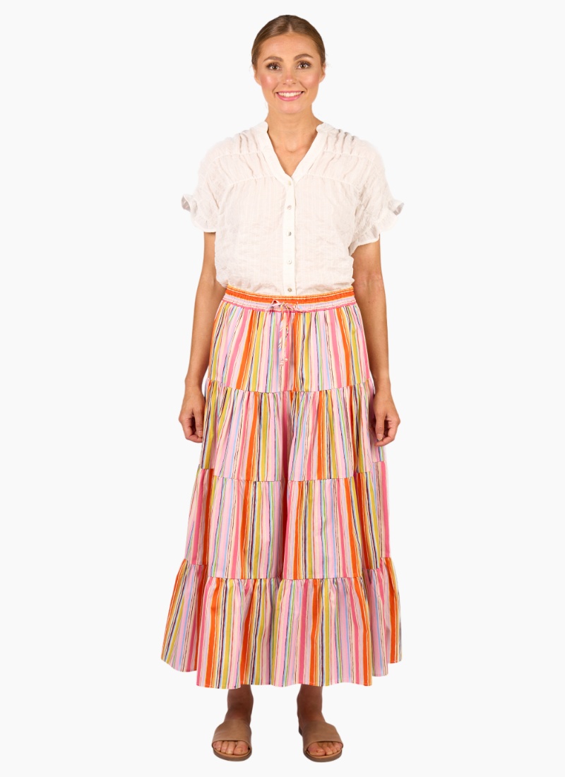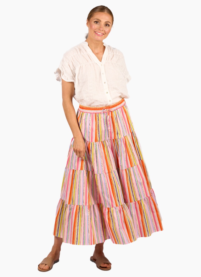 The Kaia Skirt in Bonbon is all about easy summer style. Made from a lightweight cotton fabric, it features a breezy tiered silhouette and an elastic waistband with a tie front finished with playful pink beads. A colourful striped, feel-good skirt that’s made for warm days.100% Cotton • Made from a lightweight cotton fabric • Pull on style with elastic waistband • Centre front tie fastening with pink beads • Midi length 4-tiered flare fit • Model is 175cm tall, and wears size 10