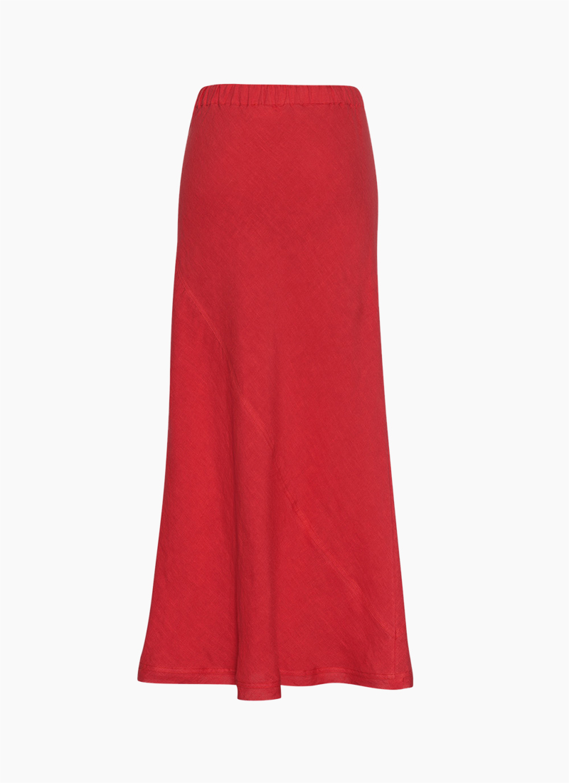 Midi length bias skirt with a diagonal seam, elasticated waist, with a self tie with knotted ends.Composition: 100% Linen