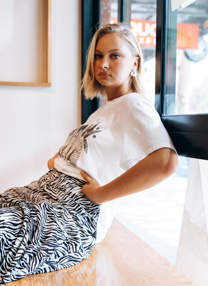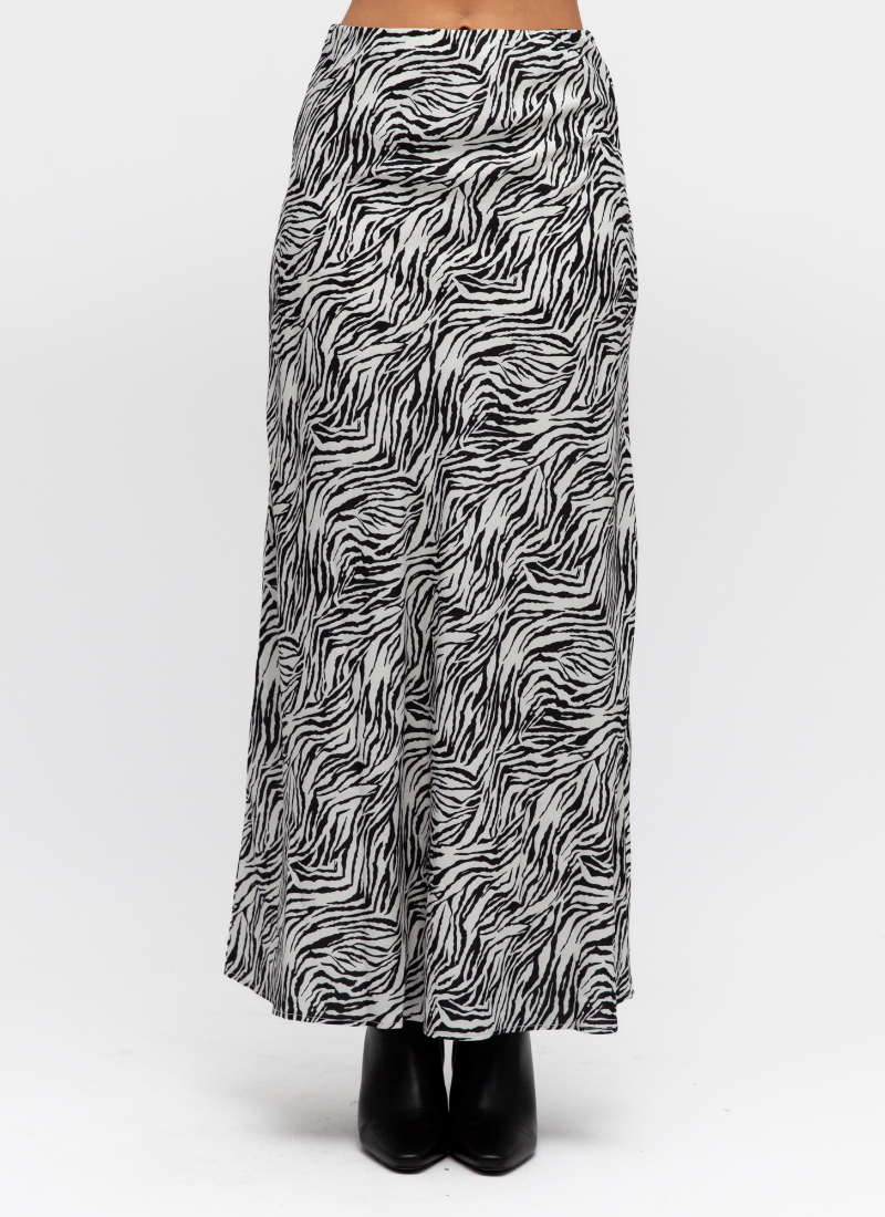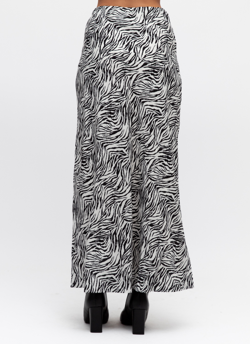 Introducing the Zebra Skirt from Paper Heart. This striking piece combines bold animal print with a refined, flowing silhouette for modern everyday elegance.