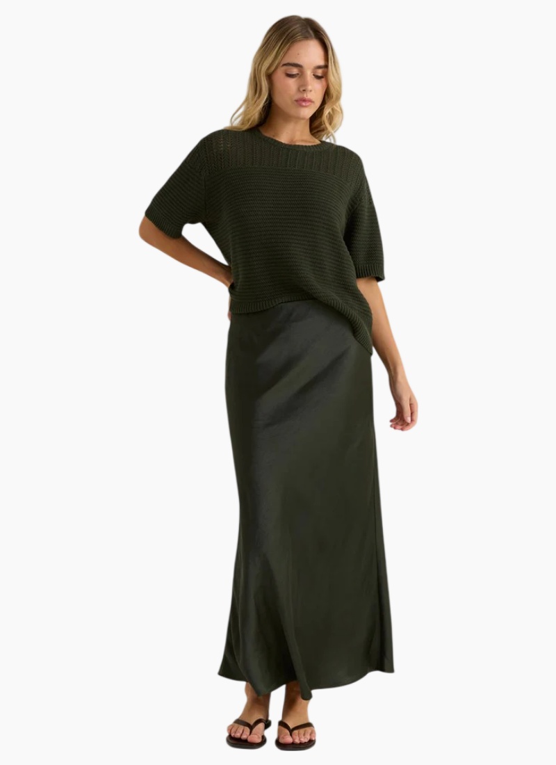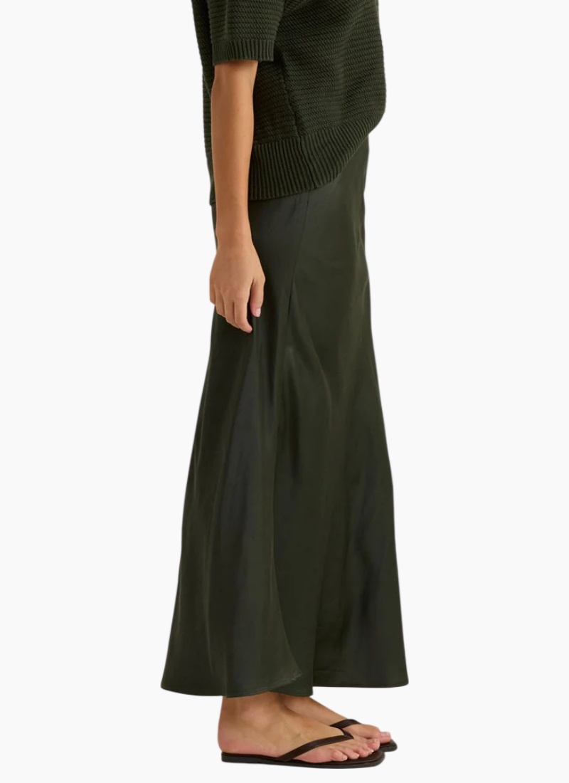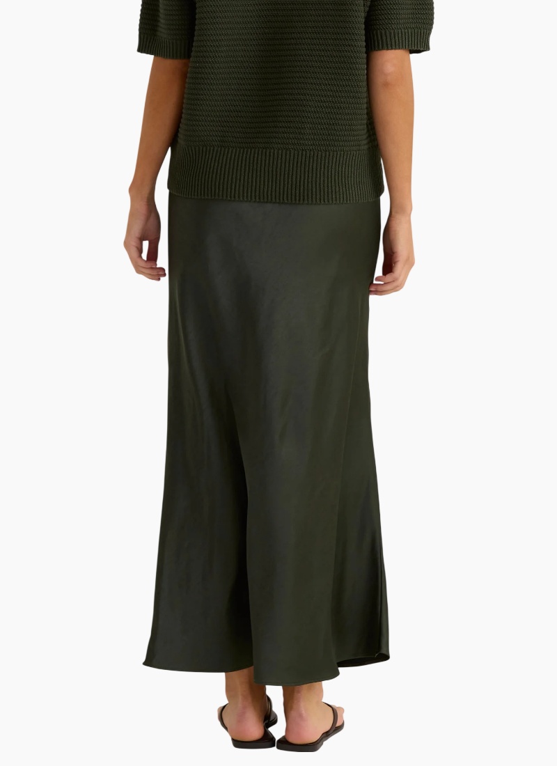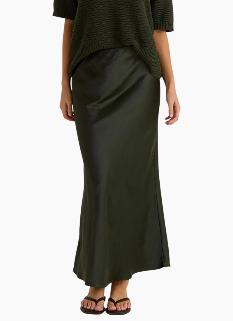 Introducing the Jasper Slip Skirt from SASS. This elegant maxi skirt in deep olive offers a fluid, satin finish that moves beautifully with every step.
