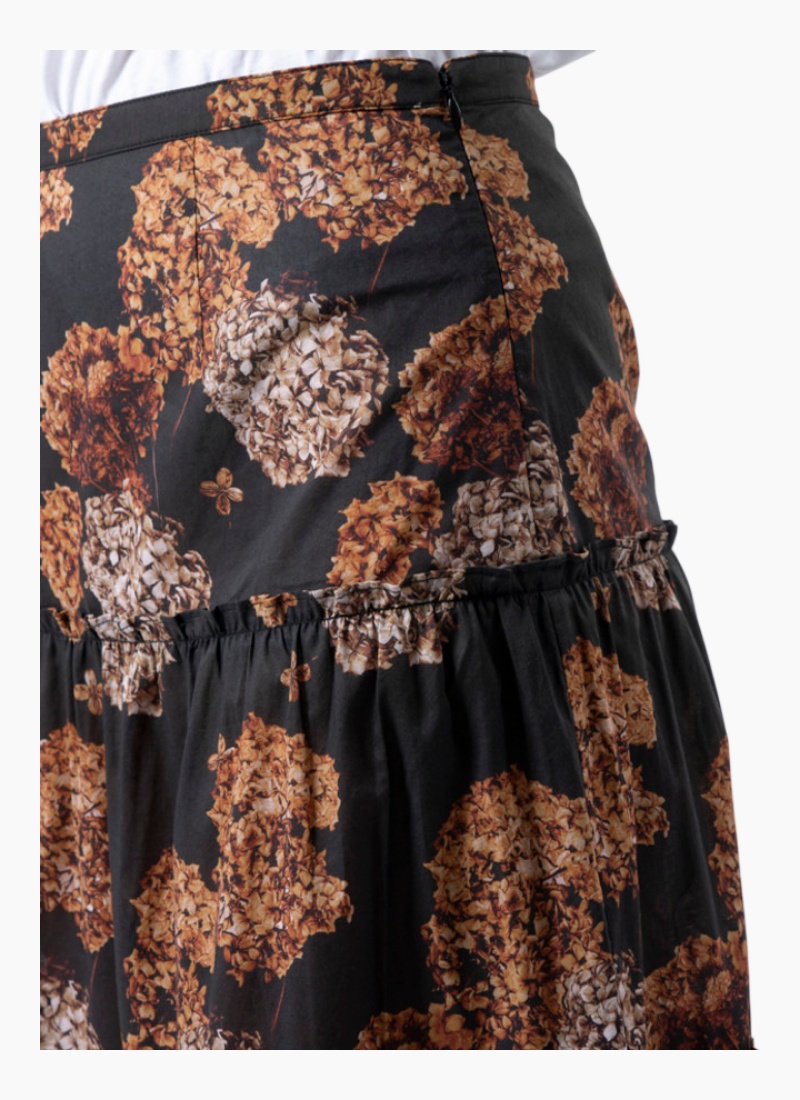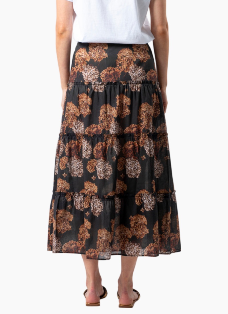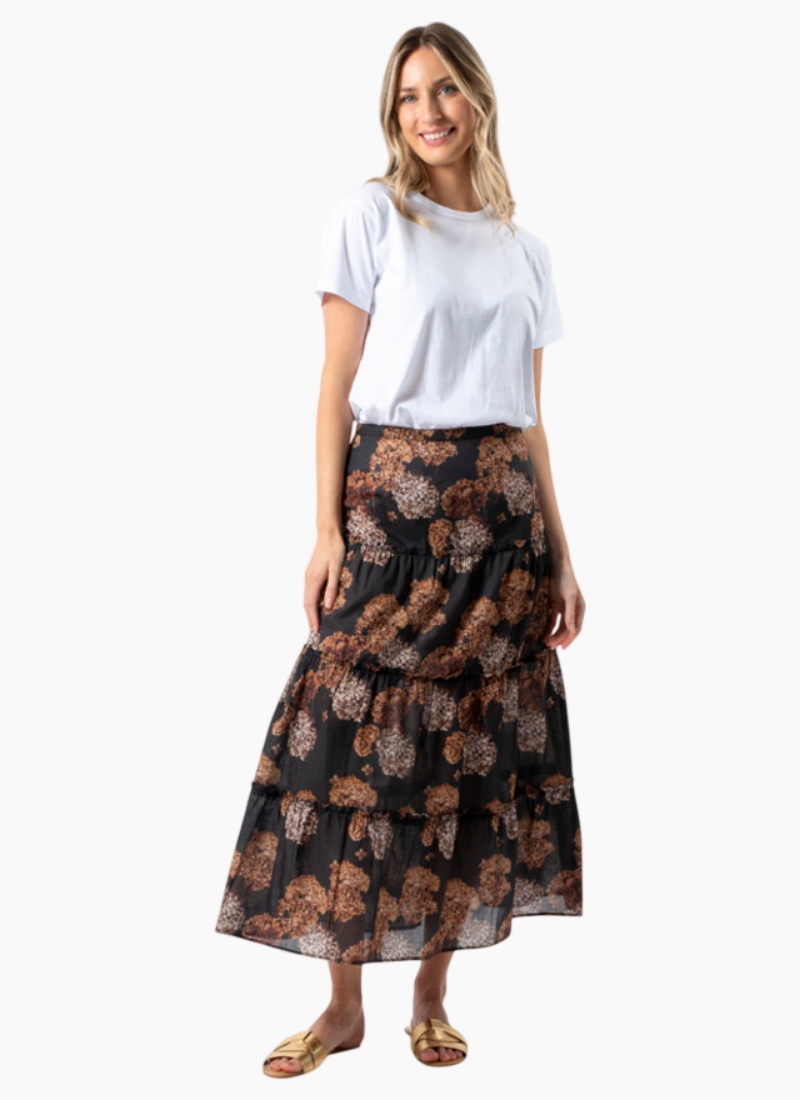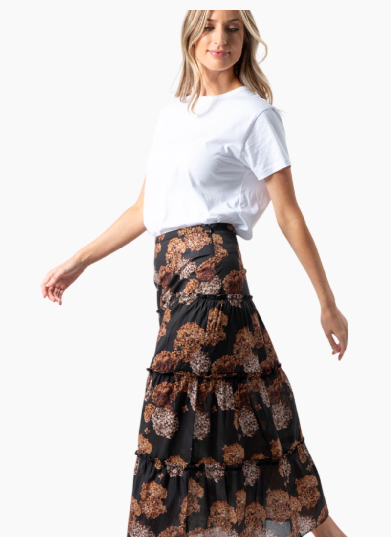 Introducing the Dawson Skirt from Stella + Gemma. This flowing maxi skirt blends a black base with warm brown floral motifs and a lightweight chiffon feel for elegant movement.