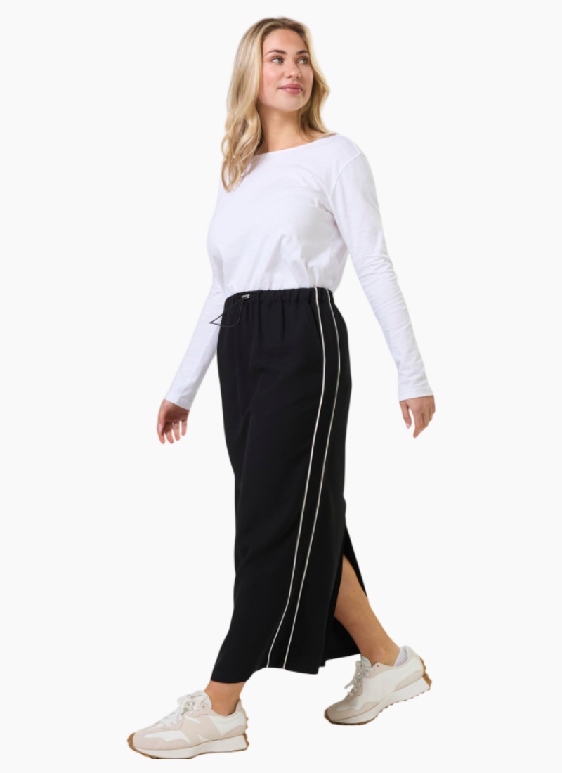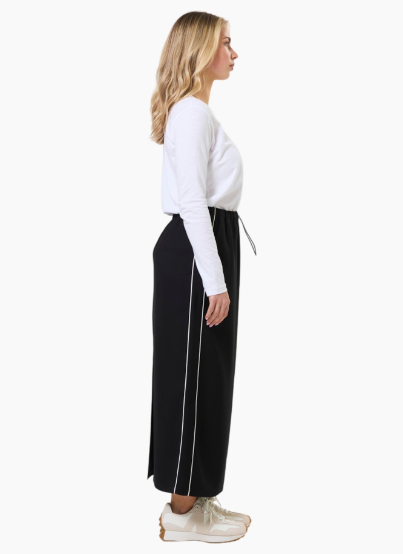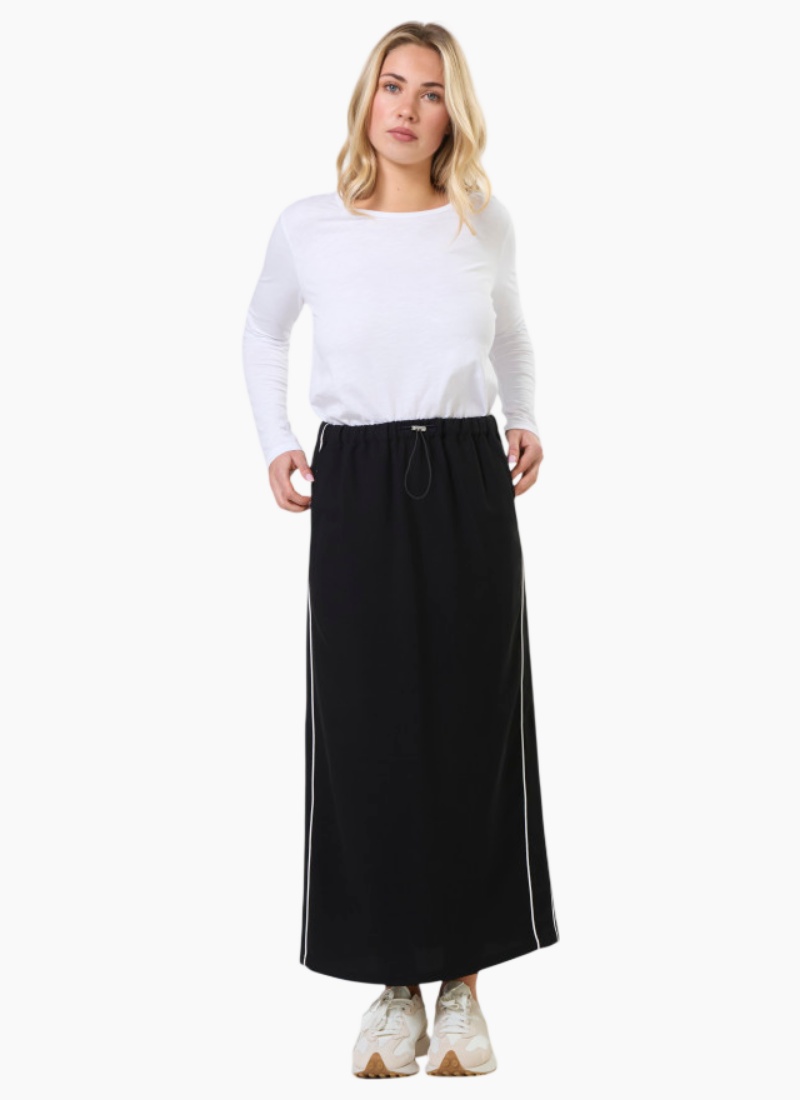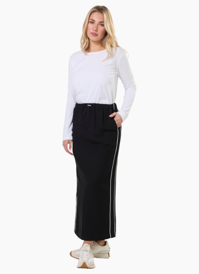 Introducing the Park Skirt from Stella + Gemma. A relaxed ankle-length maxi skirt in black that blends sporty detailing with everyday polish.