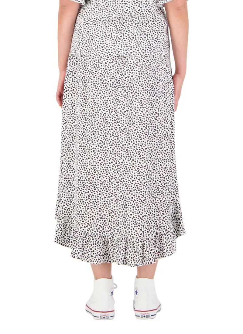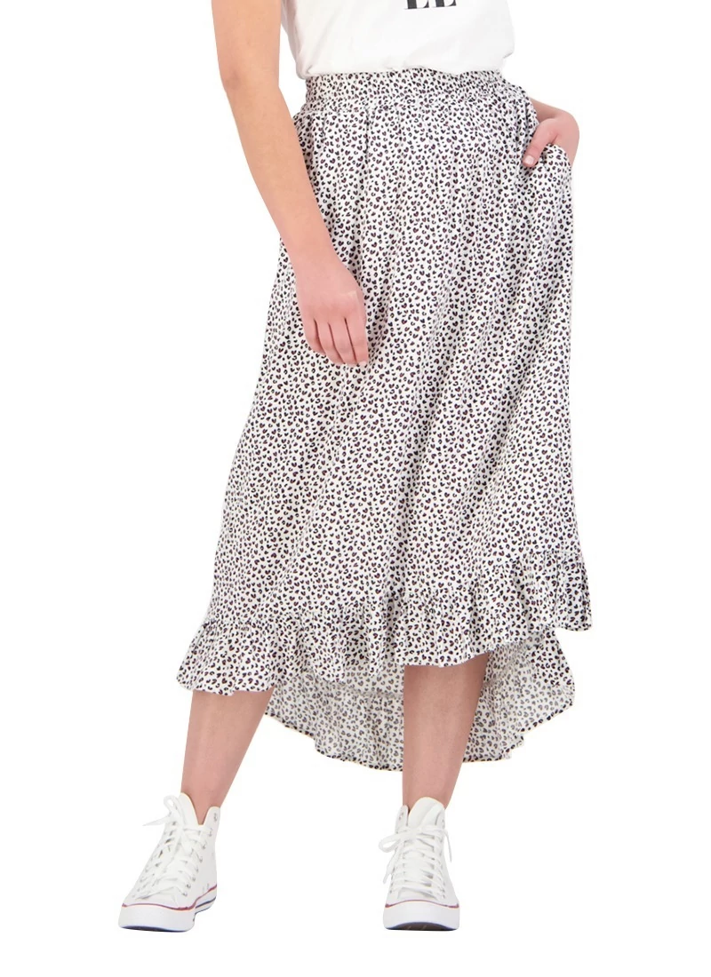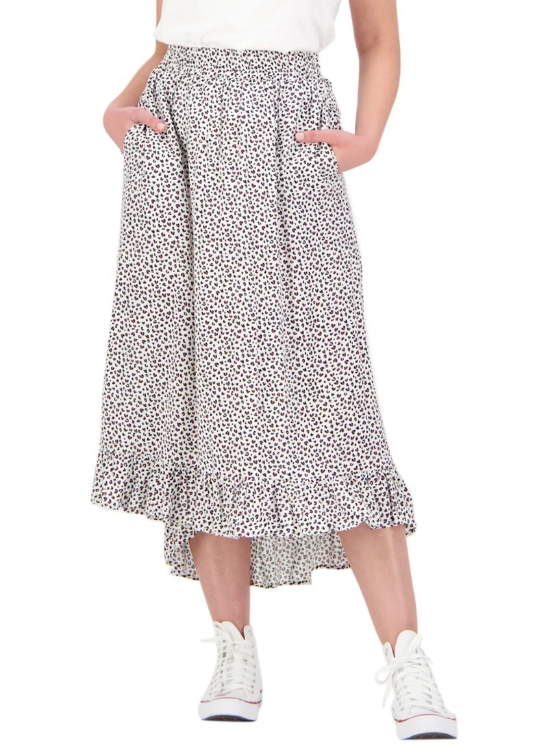 The sweetest skirt for spring. Long in length with a raised front hem and lowered back hem- this piece is so divine! Has an elasticated waistband, frill hem detail and pockets!
