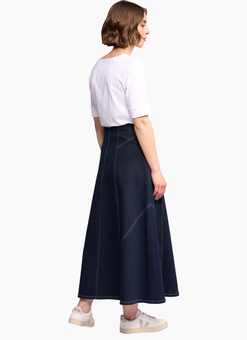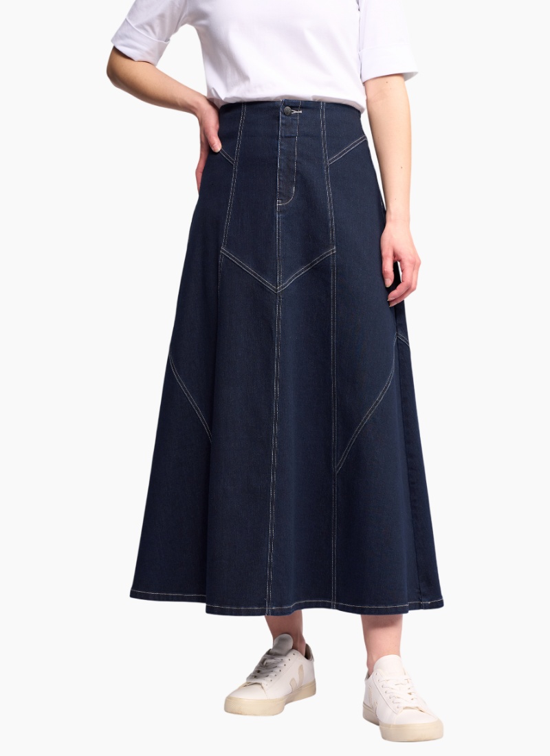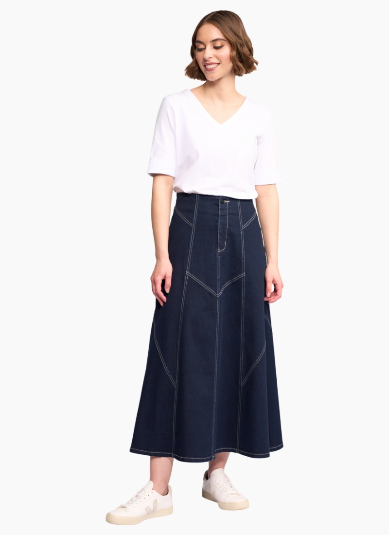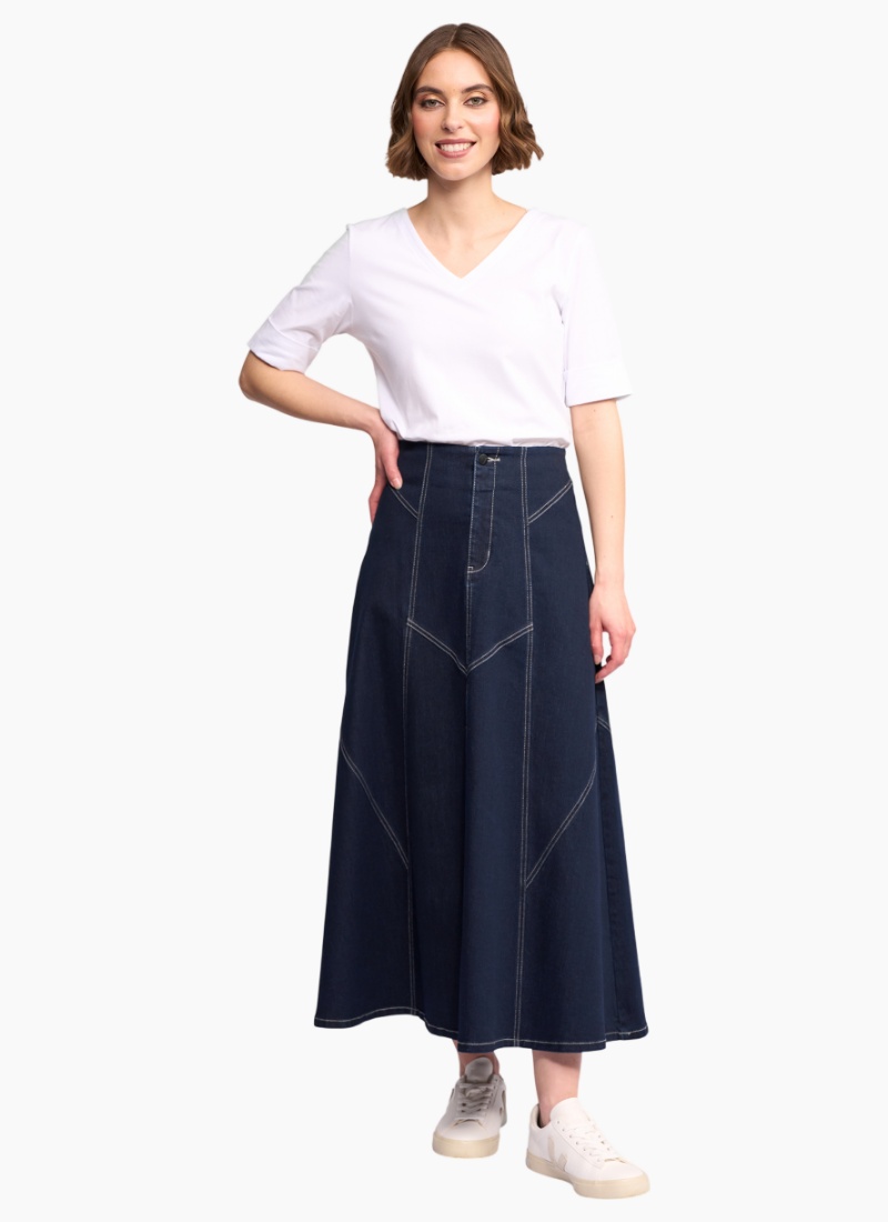 - Denim from Vassalli. This panelled denim maxi skirt in a deep ink shade combines modern lines with easy everyday wear.