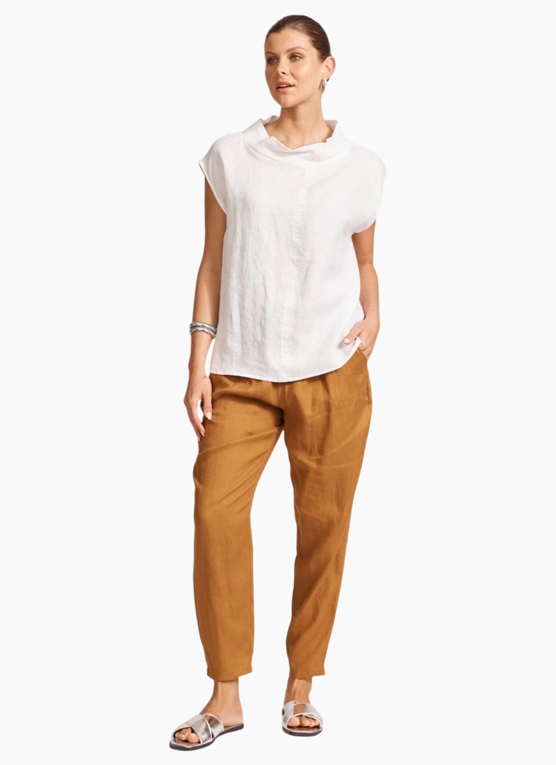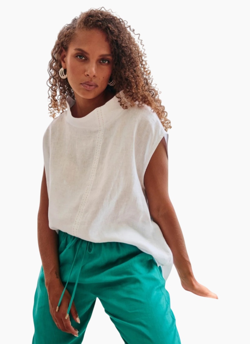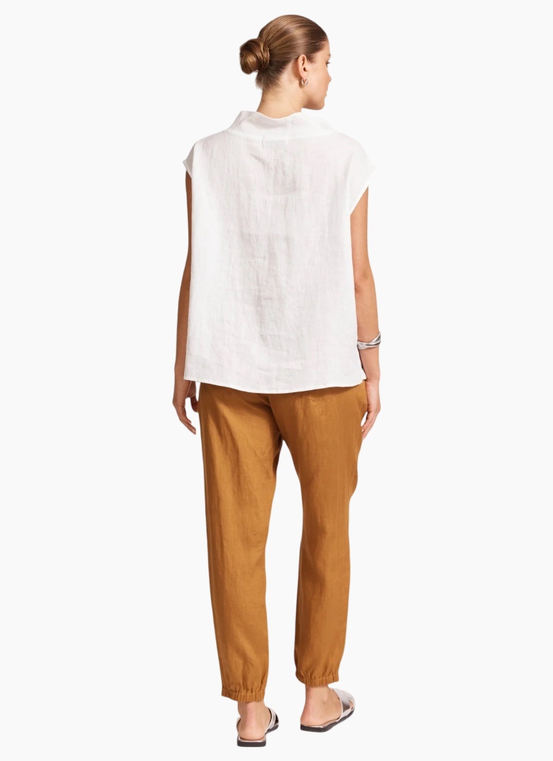 A best-selling linen top with sophisticated ease. Crafted from 100% linen for natural breathability. Features a relaxed high collar, cap sleeves, diagonal decorative topstitching, and soft, loose fit.Style with tailored pants and a leather handbag for a chic date night look, or pair with a flowing maxi skirt for summer dressing. Relaxed high collar Cap sleeves Diagonal decorative topstitching Loose fit