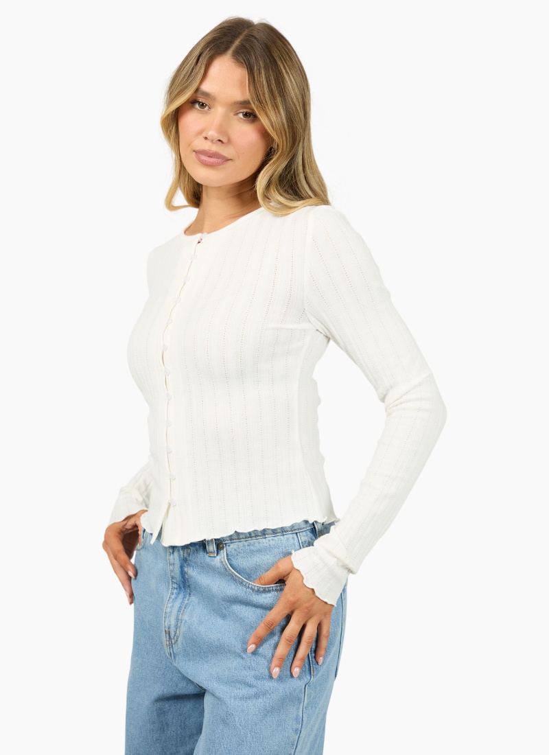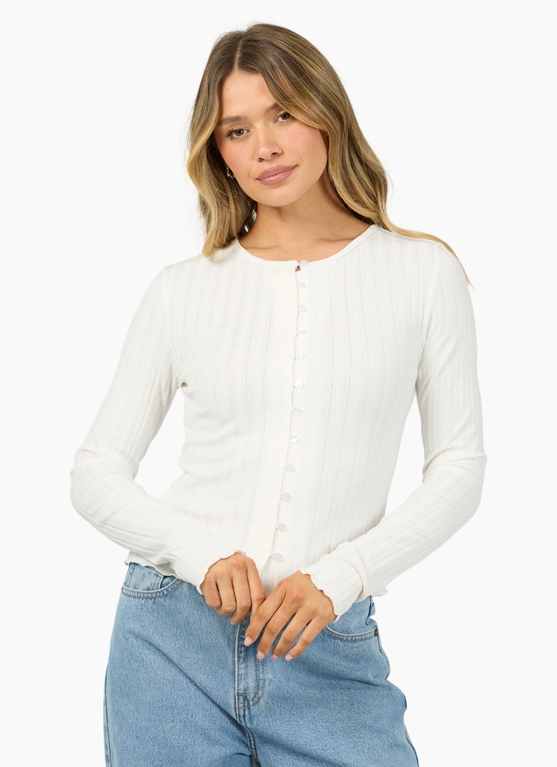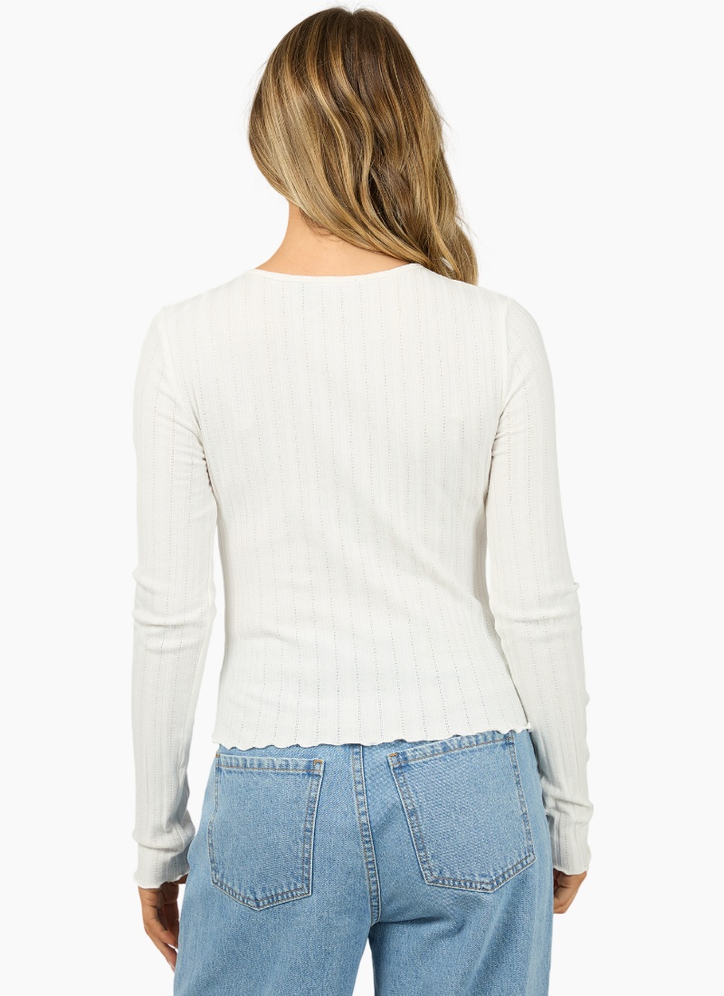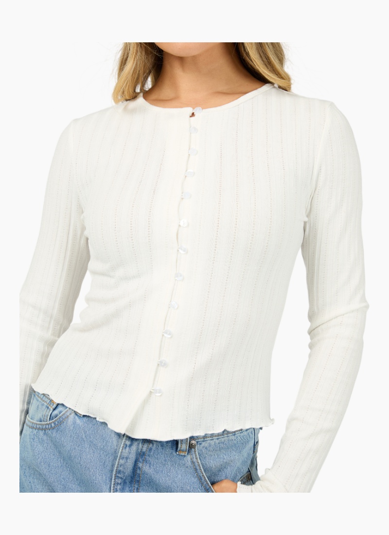 Introducing the Tarni Knit Top from All About Eve. This elegant white knit is a timeless wardrobe staple with a refined, feminine finish.