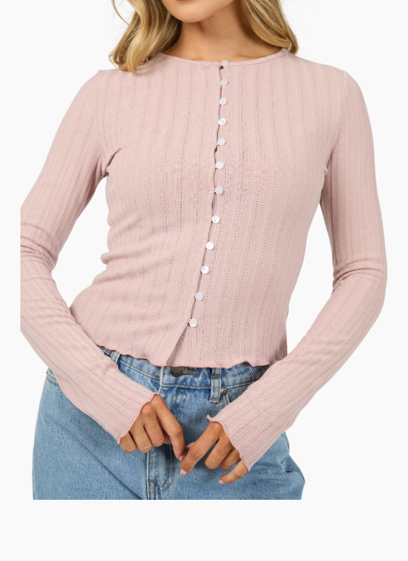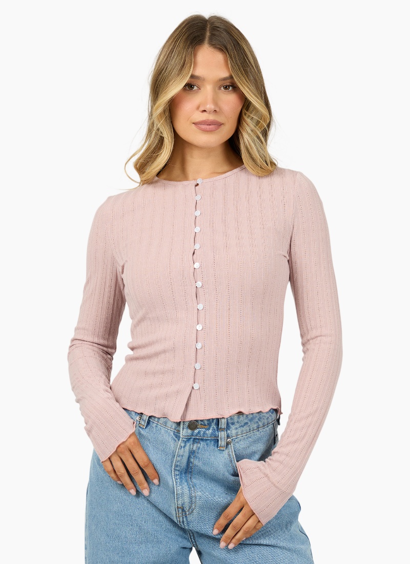 Introducing the Tarni Knit Top from All About Eve. This refined blush pink piece adds a delicate, elevated touch to everyday looks.