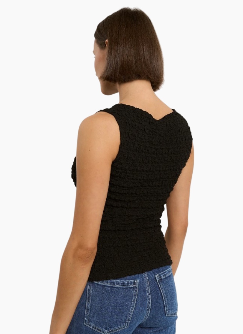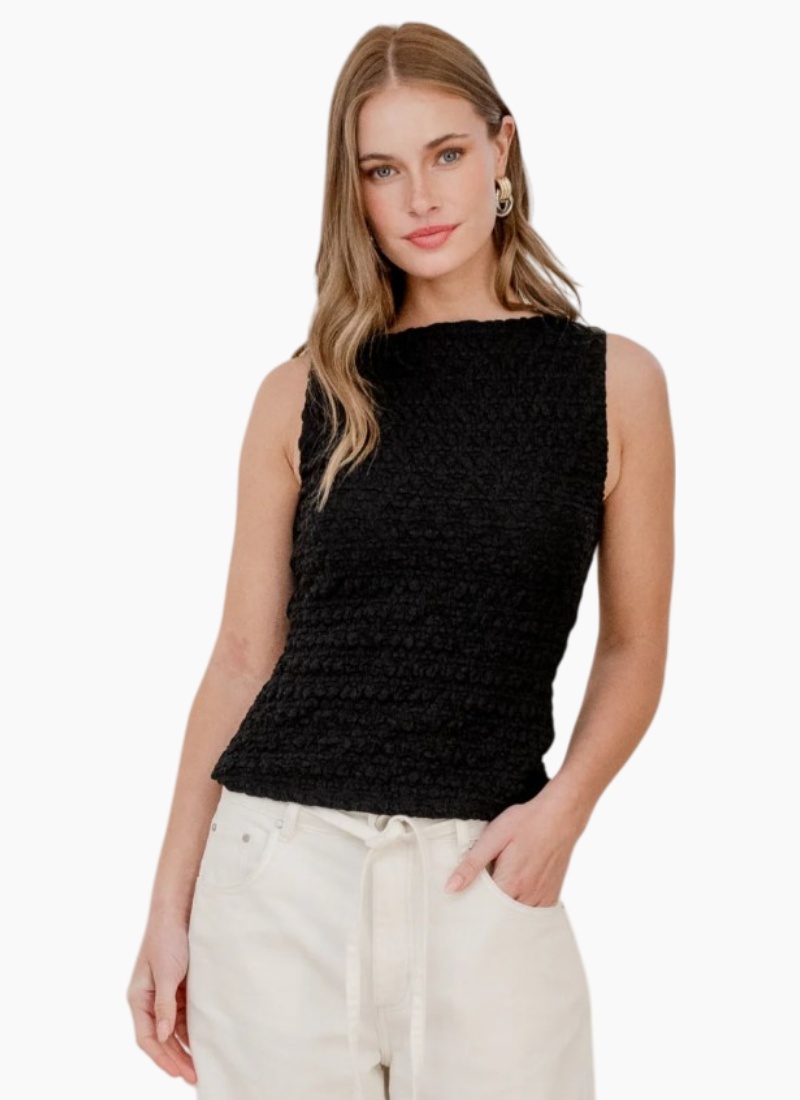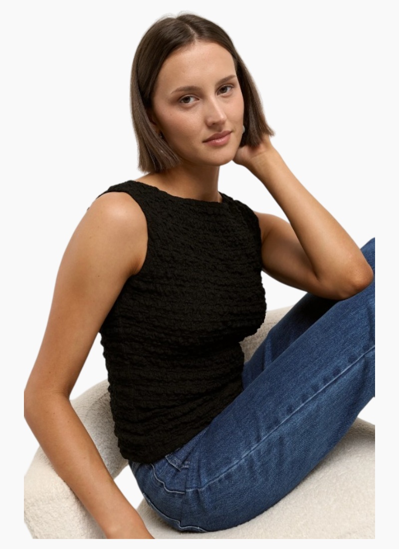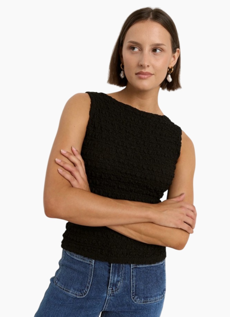 Make a sleek statement with the Untamed black lace top, your shortcut to texture-rich, elevated dressing. The sculpted stretch fabric hugs in all the right places while the sleeveless cut keeps it chic and breezy. It's the kind of top that instantly levels up denim and balances beautifully with tailored pants or flowing skirts.This is your ultimate high-low staple, easy to dress up with bold accessories or down with casual denim.