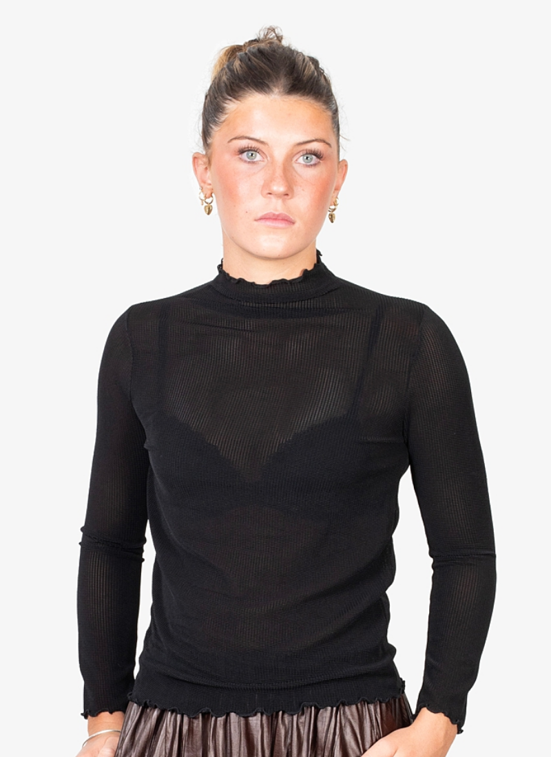 - Crafted from lightweight sheer mesh (nylon/spandex) in deep black for breathable, sculpted layering