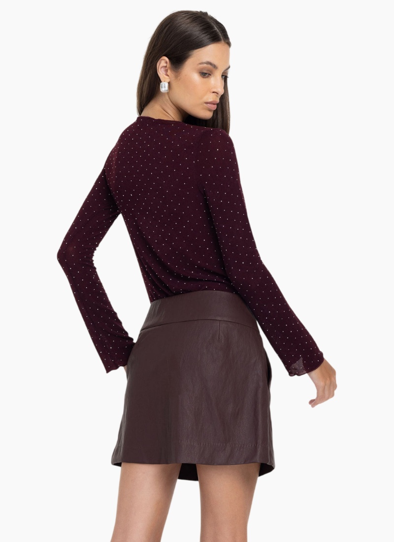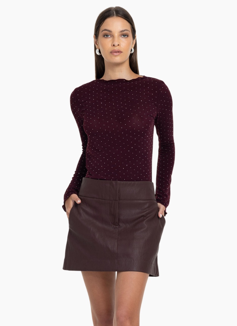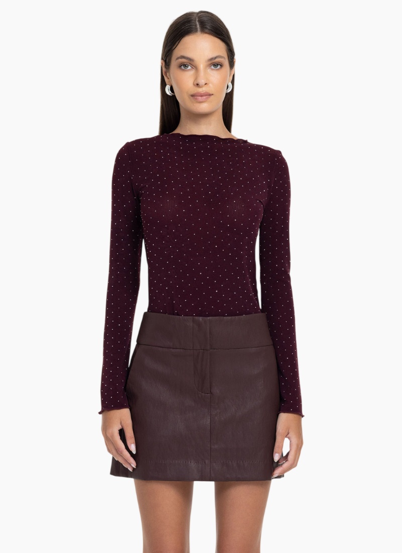 Introducing the Gigi Top from Blak. This burgundy, silver-diamanté embellished ribbed knit top offers understated glamour for day-to-night dressing.