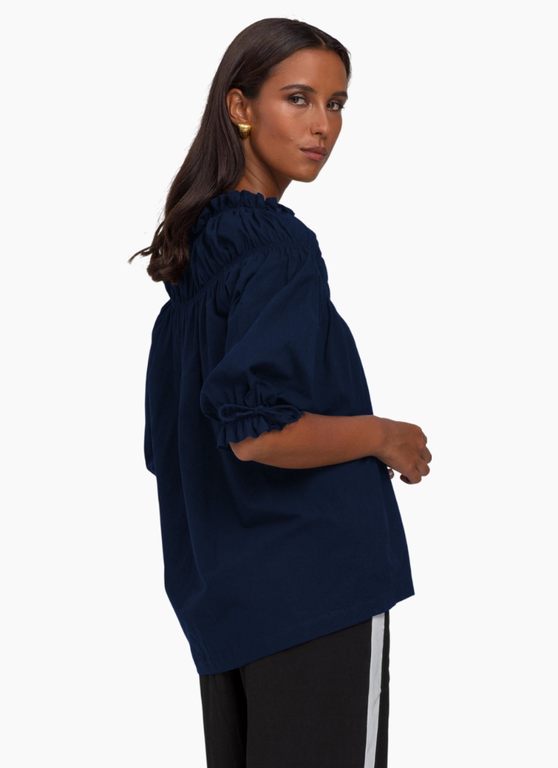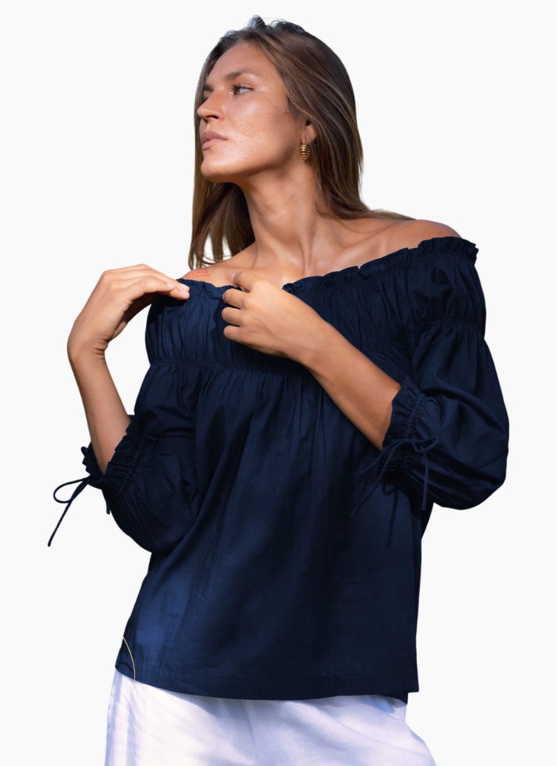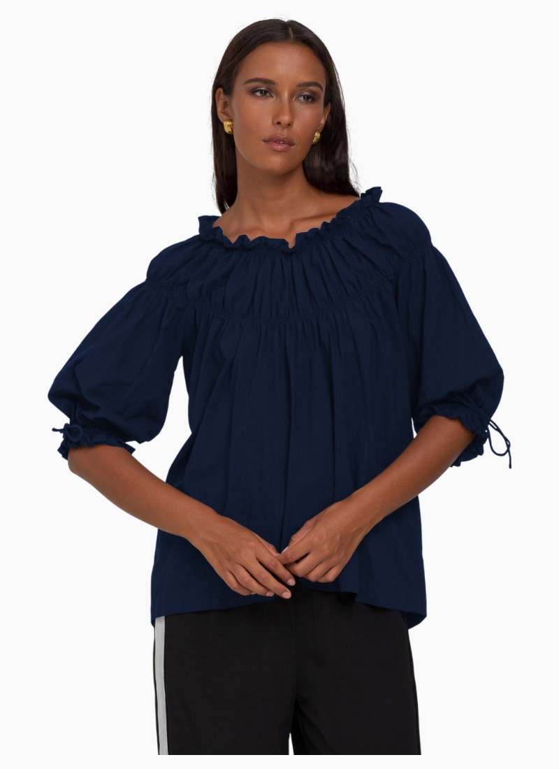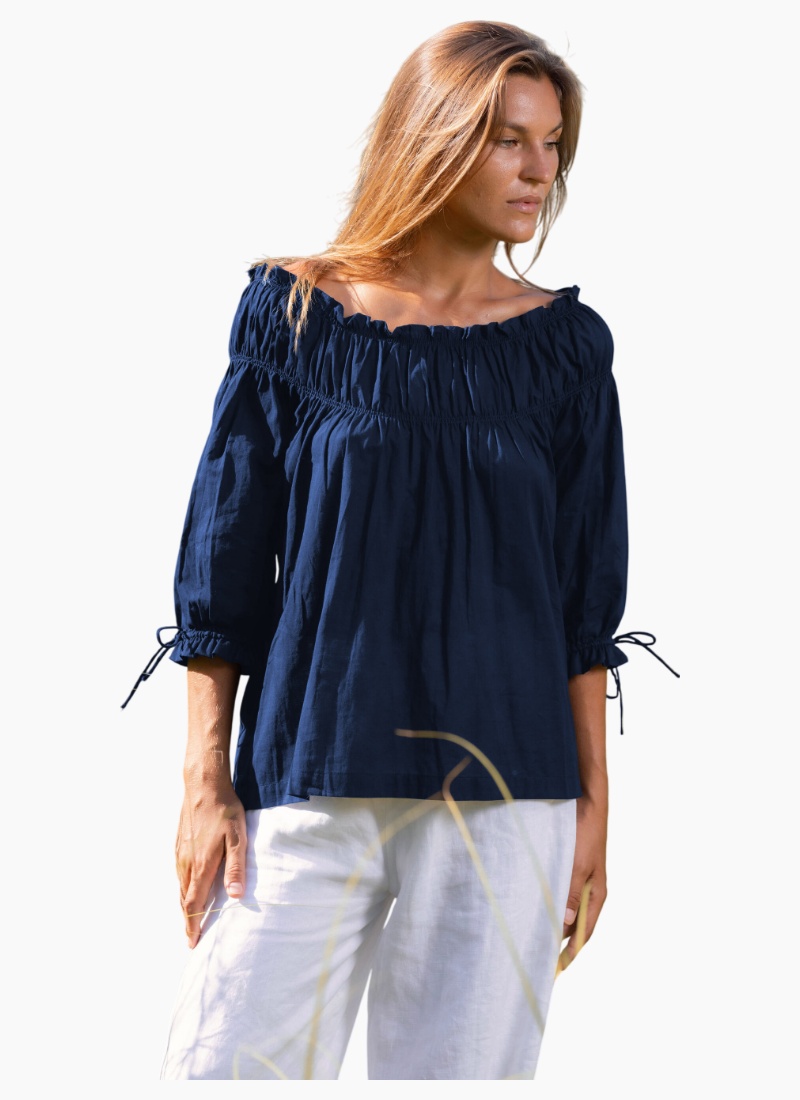 Introducing the highly sought after With Hope Top - crafted from premium washed cotton. Its boat style neckline, complete with elastic and a gathered frill, adds an exclusive touch. The elastic gather detailing above the bust creates a full-bodied, sophisticated look. The elbow-length sleeves, featuring elastic and a rouleau tie with a hem frill, add to the elegance. The top is finished with a straight hem at mid-hip, giving it a tasteful and refined look.Boat style neckline with elastic and gathered frill Elastic gather detailing above bust to create a full body Elbow length sleeve has elastic and rouleau tie with hem frill Straight hem finished at mid hip